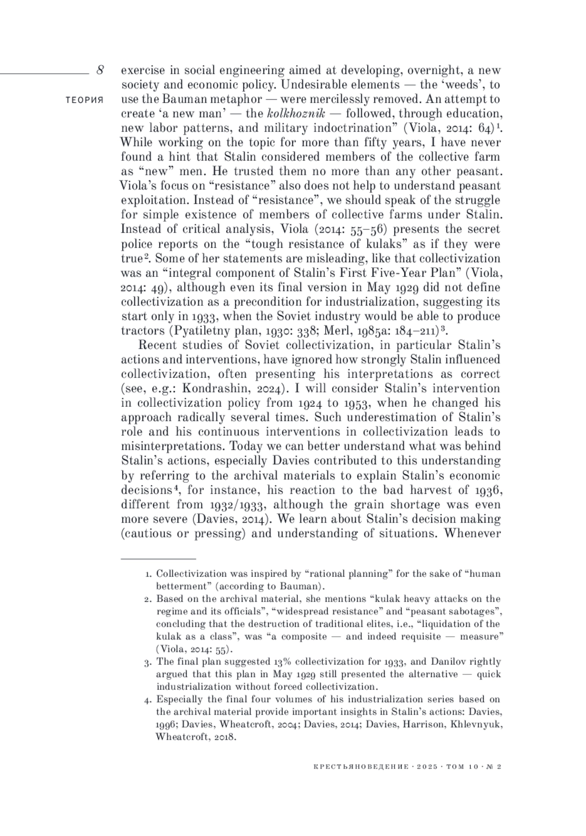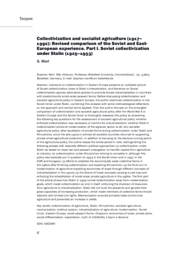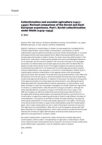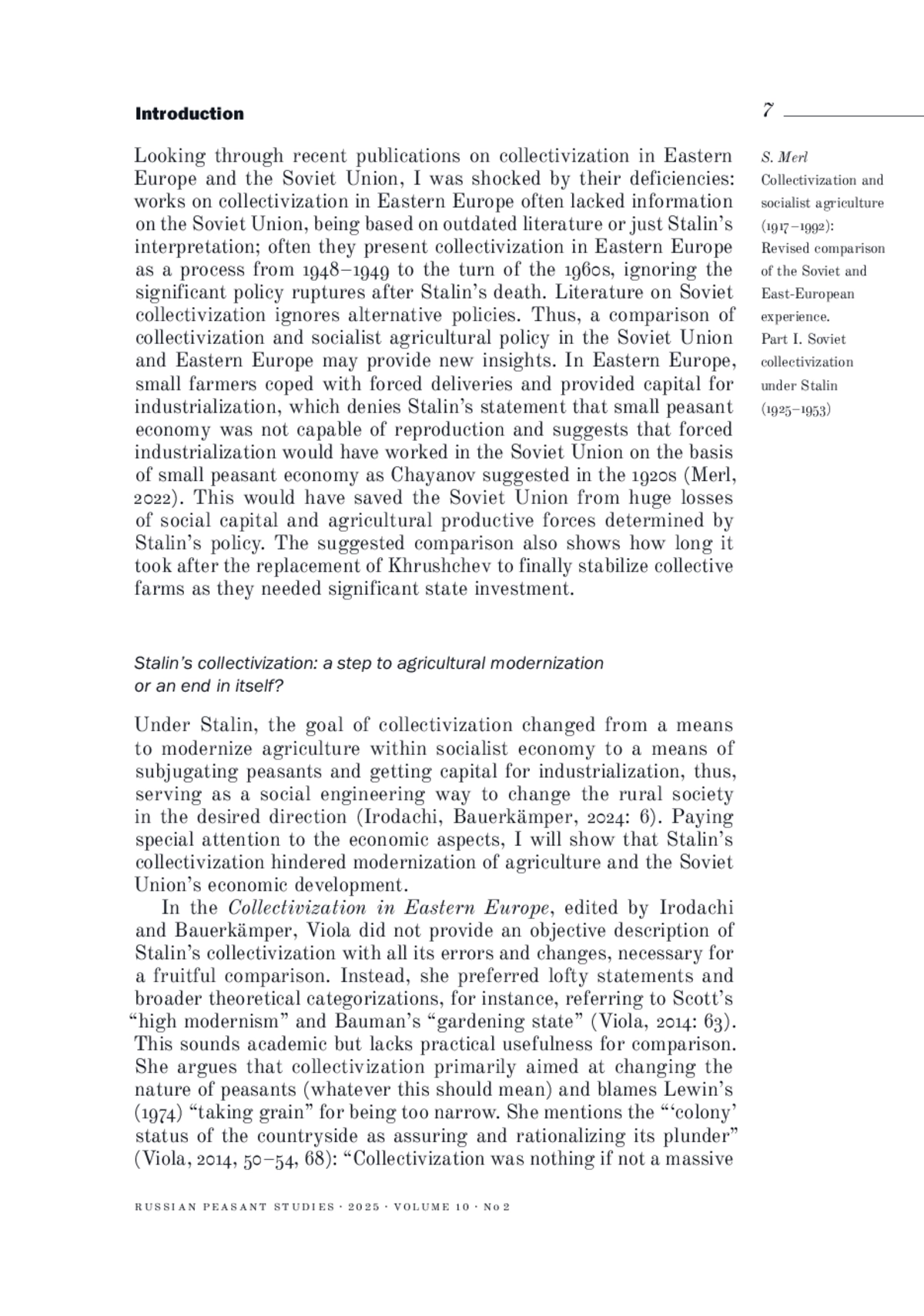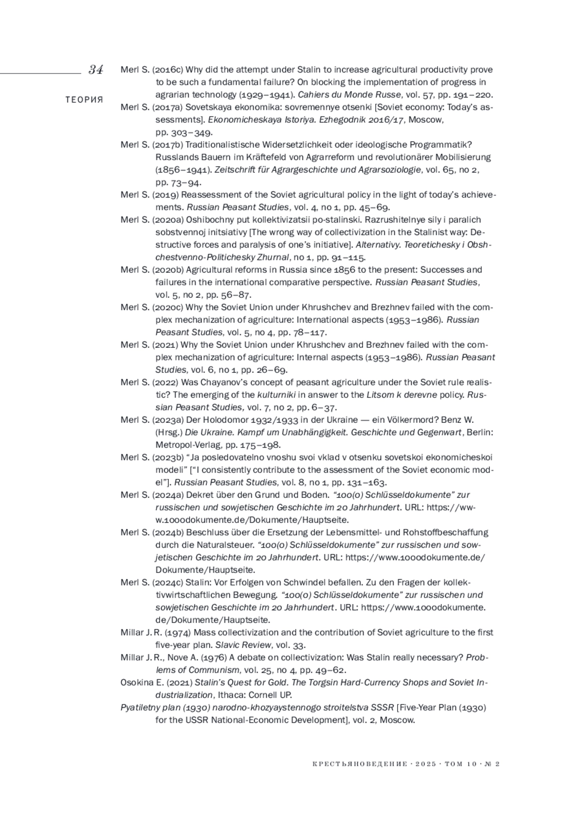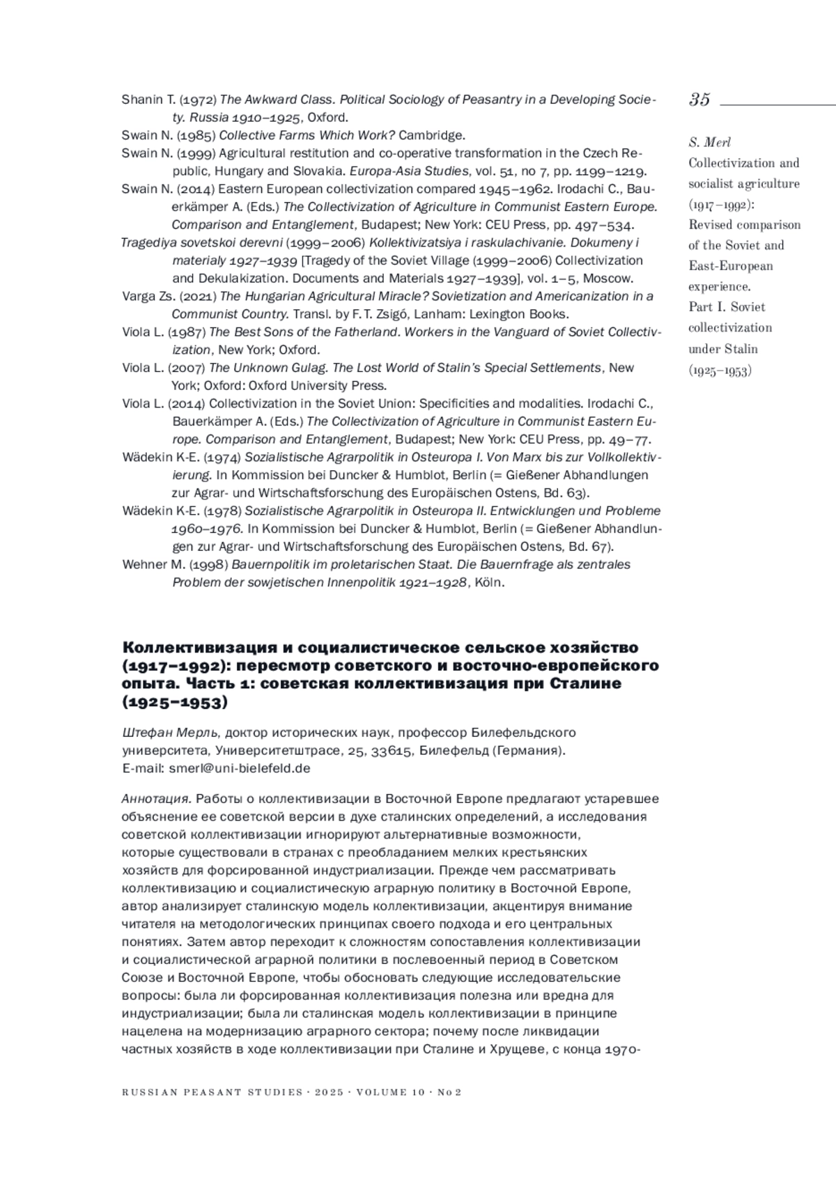 MERL S. COLLECTIVIZATION AND SOCIALIST AGRICULTURE (1917- 1992): REVISED COMPARISON OF THE SOVIET AND EAST-EUROPEAN EXPERIENCE. PART I. SOVIET COLLECTIVIZATION UNDER STALIN (1925-1953) // КРЕСТЬЯНОВЕДЕНИЕ. 2025. Т. 10 № 2