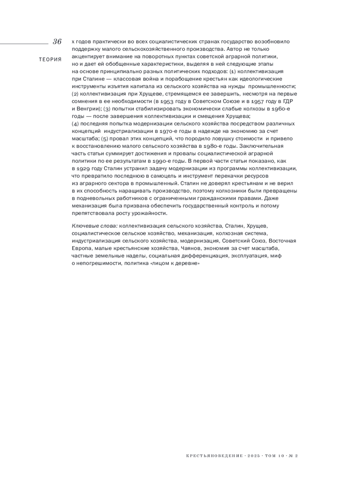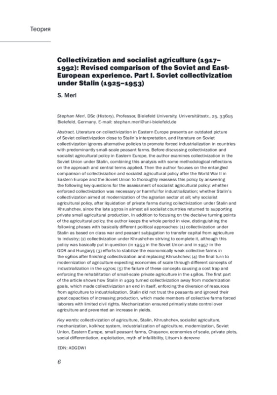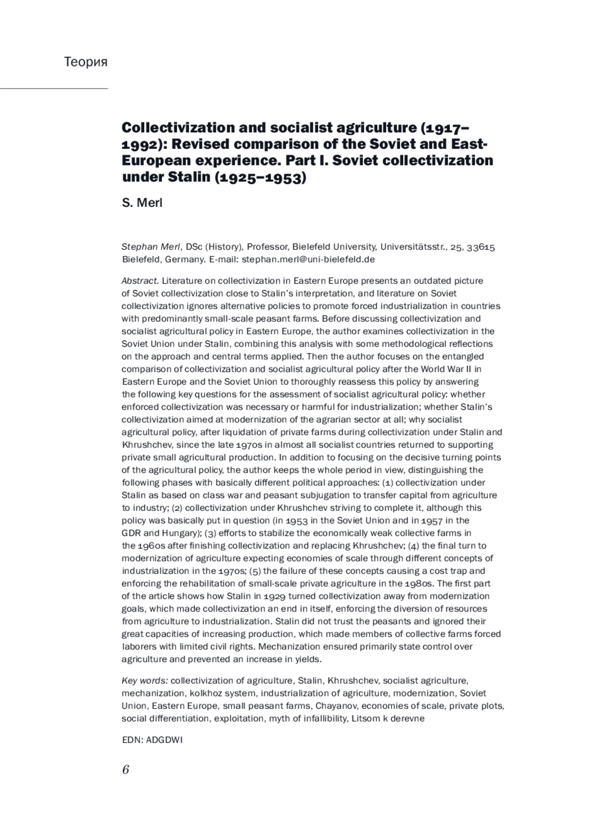 Ключевые фразы: collectivization of agriculture, stalin, khrushchev, socialist agriculture, mechanization, kolkhoz system, industrialization of agriculture, modernization, soviet union, eastern europe, small peasant farms, chayanov, economies of scale, private plots, social differentiation, exploitation, myth of infallibility, litsom k derevne, коллективизация сельского хозяйства, СТАЛИН, хрущев, социалистическое сельское хозяйство, МЕХАНИЗАЦИЯ, колхозная система, индустриализация сельского хозяйства, модернизация, Советский Союз, Восточная Европа, малые крестьянские хозяйства, чаянов, экономия за счет масштаба, частные земельные наделы, СОЦИАЛЬНАЯ ДИФФЕРЕНЦИАЦИЯ, ЭКСПЛУАТАЦИЯ, миф о непогрешимости, политика "лицом к деревне"