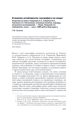 Выход в свет монографии авторского коллектива из Тверского государственного университета А. А. Смирновой (Фомкиной), И. П. Смирнова и А. А. Ткаченко по праву можно назвать заметным событием для отечественной географии. Современная российская география населения, несмотря на в целом состоявшуюся академическую традицию, редко пополняется фундаментальными трудами, сопоставимыми по глубине и широте охвата с настоящей книгой. Напомним, что последняя подобная по значимости работа в отрасли вышла более двух десятилетий назад2
