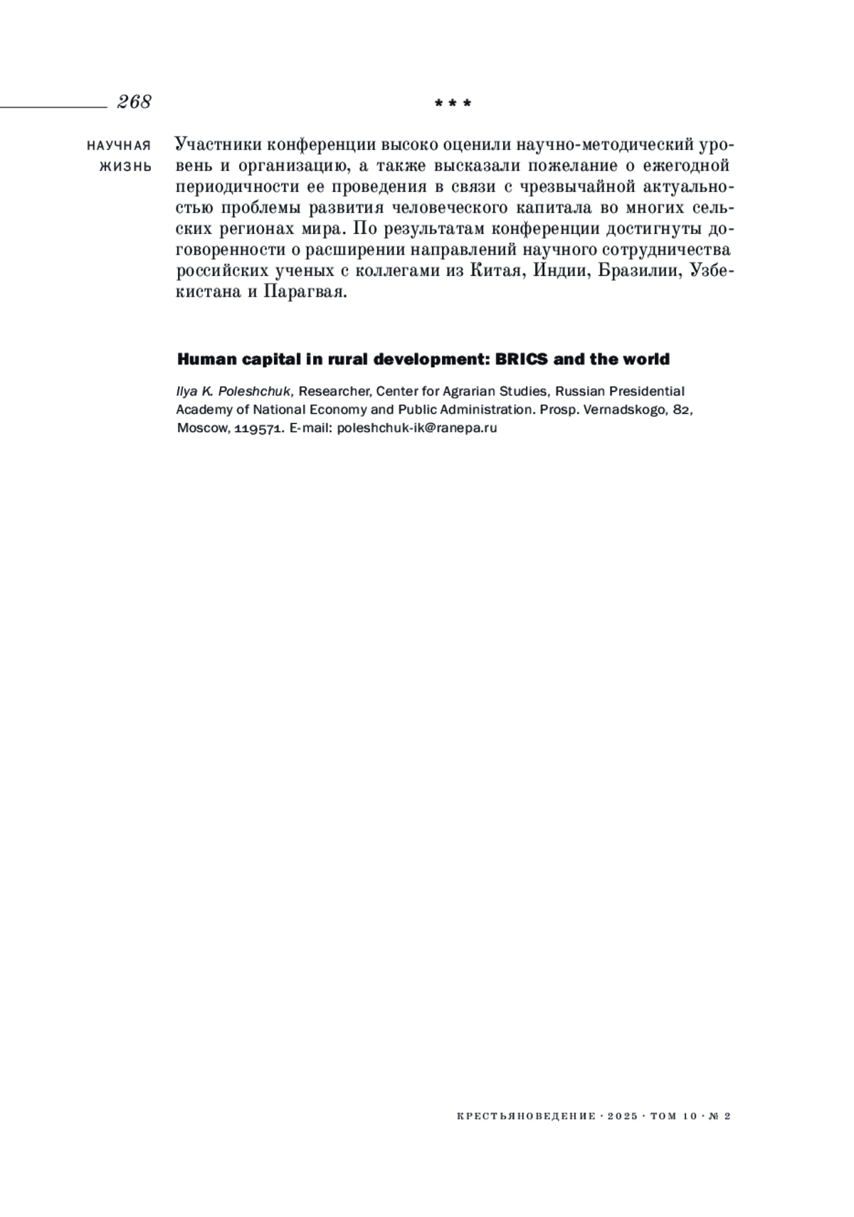 28–29 ноября 2024 года одновременно в Москве, Пекине, Риу-Гранди-ду-Сул, а также онлайн состоялась Международная научная конференция «Человеческий капитал в сельском развитии: БРИКС и мир». Проведение этого научного форума было инициировано участниками проекта научного центра мирового уровня Российской академии народного хозяйства и государственной службы при Президенте РФ (РАНХиГС) «Человеческий капитал в сельском развитии: Россия и мир» при поддержке Института общественных наук РАНХиГС, национального проекта России: «Наука и университеты», а также редакции журнала «Крестьяноведение»