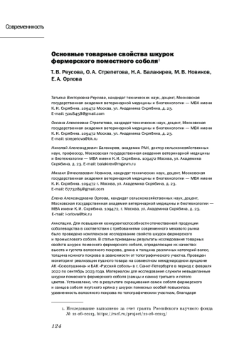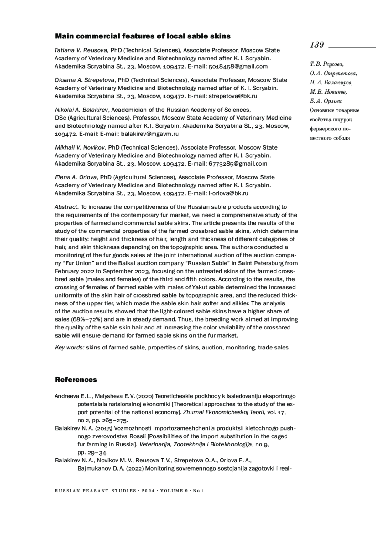 7. Новиков М. В., Реусова Т. В., Стрепетова О. А. (2023). Исследование основных свойств волосяного покрова шкурок соболя клеточного разведения и промыслового // Кролиководство и звероводство. № 3. С. 16-26. EDN: DOIOCA