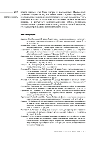 11. Сухинина Т. В., Бобылева О. В. (2014). Влияние способов раскроя мехового полуфабриката на выход готовых меховых изделий // Актуальные проблемы ветеринарной медицины, зоотехнии и биотехнологии: сборник научных трудов. М.: МГАВМиБ им. К. И. Скрябина. С. 425-426. EDN: UMWMKN