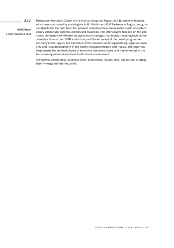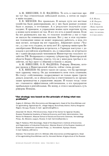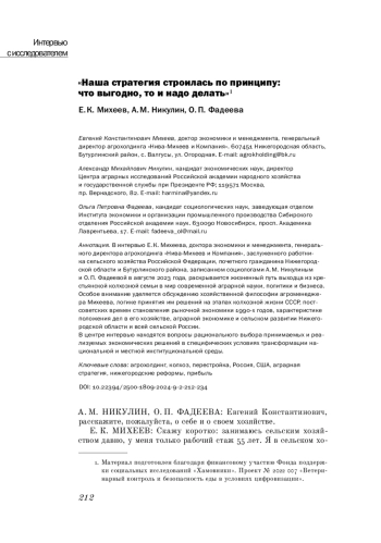 В интервью Е. К. Михеева, доктора экономики и менеджмента, генерального директора агрохолдинга «Нива-Михеев и Компания», заслуженного работника сельского хозяйства Российской Федерации, почетного гражданина Нижегородской области и Бутурлинского района, записанном социологами А. М. Никулиным и О. П. Фадеевой в августе 2023 года, раскрывается жизненный путь выходца из крестьянской колхозной семьи в мир современной аграрной науки, политики и бизнеса. Особое внимание уделяется обсуждению хозяйственной философии агроменеджера Михеева, логике принятия им решений на этапах колхозной жизни СССР, постсоветских времен становления рыночной экономики 1990-х годов, характеристике положения дел в его хозяйстве, аграрной экономике и сельском развитии Нижегородской области и всей сельской России. В центре интервью находятся вопросы рационального выбора принимаемых и реализуемых экономических решений в специфических условиях трансформации национальной и местной институциональной среды.