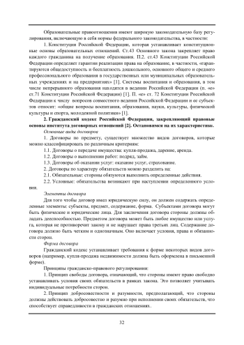 В статье дается характеристика основных аспектов гражданско-правового регулирования договорных отношений в России, а именно рассмотрены виды договоров, их элементы, принципы и механизмы защиты прав. Автором установлено, что договор об образовании - это юридический документ, который фиксирует взаимные обязательства сторон в процессе образовательной деятельности. Он может быть, как письменным, так и устным, однако для большей юридической силы рекомендуется оформлять его в письменной форме.