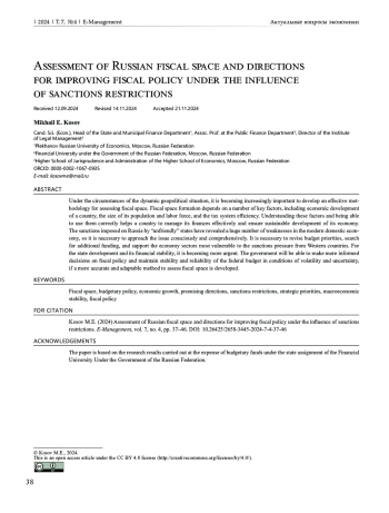 В обстоятельствах динамичной геополитической ситуации становится все более значимой разработка эффективной методики оценки фискального пространства. Формирование фискального пространства зависит от ряда основных факторов, включая экономическое развитие страны, численность населения и трудовых ресурсов, а также эффективность налоговой системы. Понимание этих факторов и умение правильно использовать их помогают государству эффективно управлять своими финансами и обеспечивать устойчивое развитие экономики. Обрушившиеся на Российскую Федерацию санкции со стороны «недружественных» государств выявили огромное количество слабых мест в современной отечественной экономике, поэтому нужно подходить к решению вопроса осознанно и комплексно. Необходимо произвести пересмотр бюджетных приоритетов, поиск дополнительного финансирования, поддержку отраслей экономики, наиболее уязвимых к санкционному давлению со стороны западных стран. Для развития государства и его финансовой устойчивости это становится все более актуальным. Правительство сможет принимать более обоснованные решения в отношении фискальной политики и поддерживать стабильность и надежность федерального бюджета в условиях волатильности и неопределенности, если будет разработан более точный и адаптируемый метод к оценке фискального пространства.