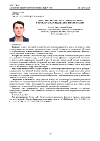 Введение: в статье с позиций аксиологического подхода исследуются роль и значение пространственно-временных факторов в расследовании преступлений. Актуальность исследования обусловлена необходимостью развития криминалистического учения о пространственно-временных факторах с учетом изменений, происходящих в современном мире.