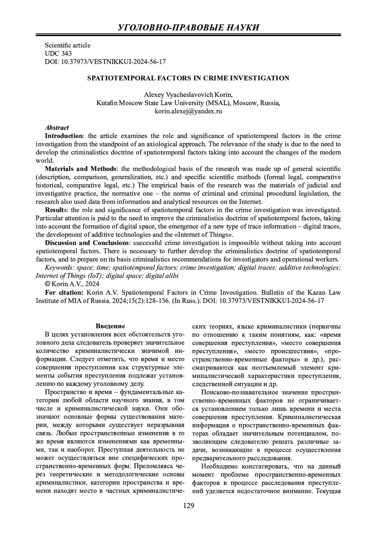 Обсуждение и заключение: автор пришел к выводу, что успешное расследование преступлений невозможно без учета пространственно-временных факторов. Необходимы дальнейшее развитие криминалистического учения о пространственно-временных факторах и подготовка на его основе криминалистических рекомендаций для следователей и оперативных сотрудников.