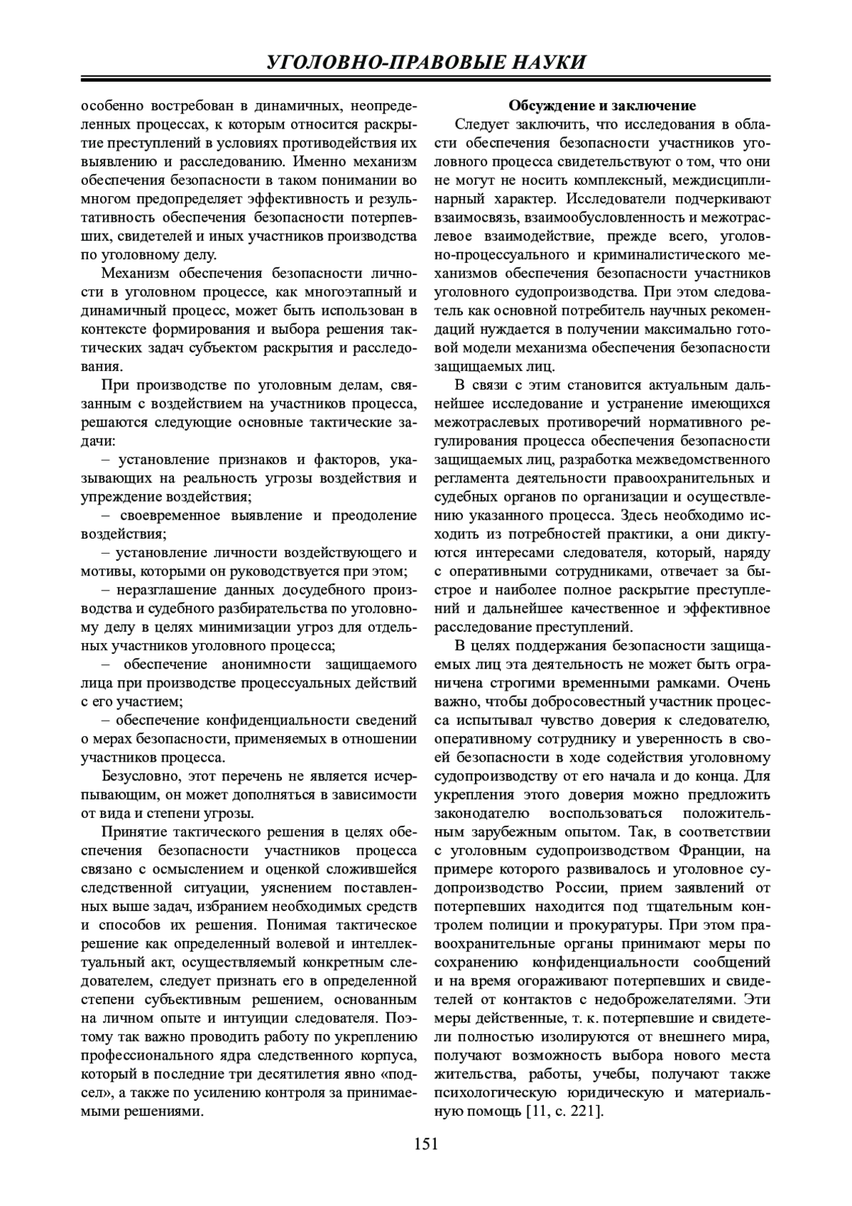 Обсуждение и заключение: изучение различных подходов к рассматриваемой проблеме позволило автору сделать вывод об отсутствии единой и цельной концепции обеспечения безопасности участников уголовного процесса. Такая концепция может быть выработана по результатам проведения междисциплинарных, межотраслевых исследований. Объективно в силу своей природы и предмета исследований полноценным инструментом к их проведению обладает наука криминалистика.