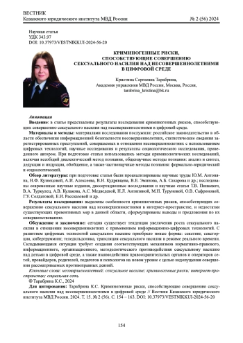 Введение: в статье представлены результаты исследования криминогенных рисков, способствующих совершению сексуального насилия над несовершеннолетними в цифровой среде.