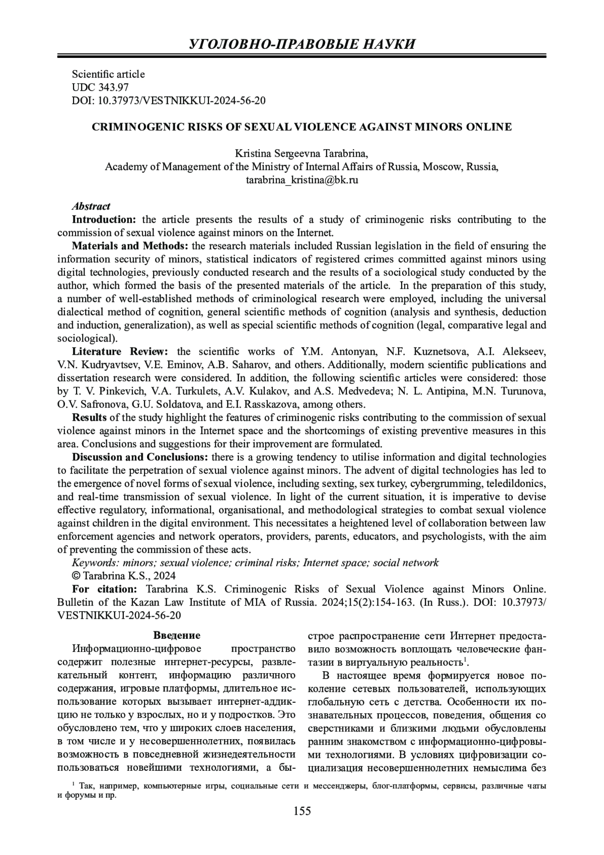 2. Пинкевич Т.В., Тарабрина К.С. Проблемные вопросы выявления преступлений, совершаемых в отношении несовершеннолетних с использованием информационно-цифровых технологий // Пробелы в российском законодательстве. 2023. Т. 16. № 7. С. 174 - 179. EDN: RYMZIH