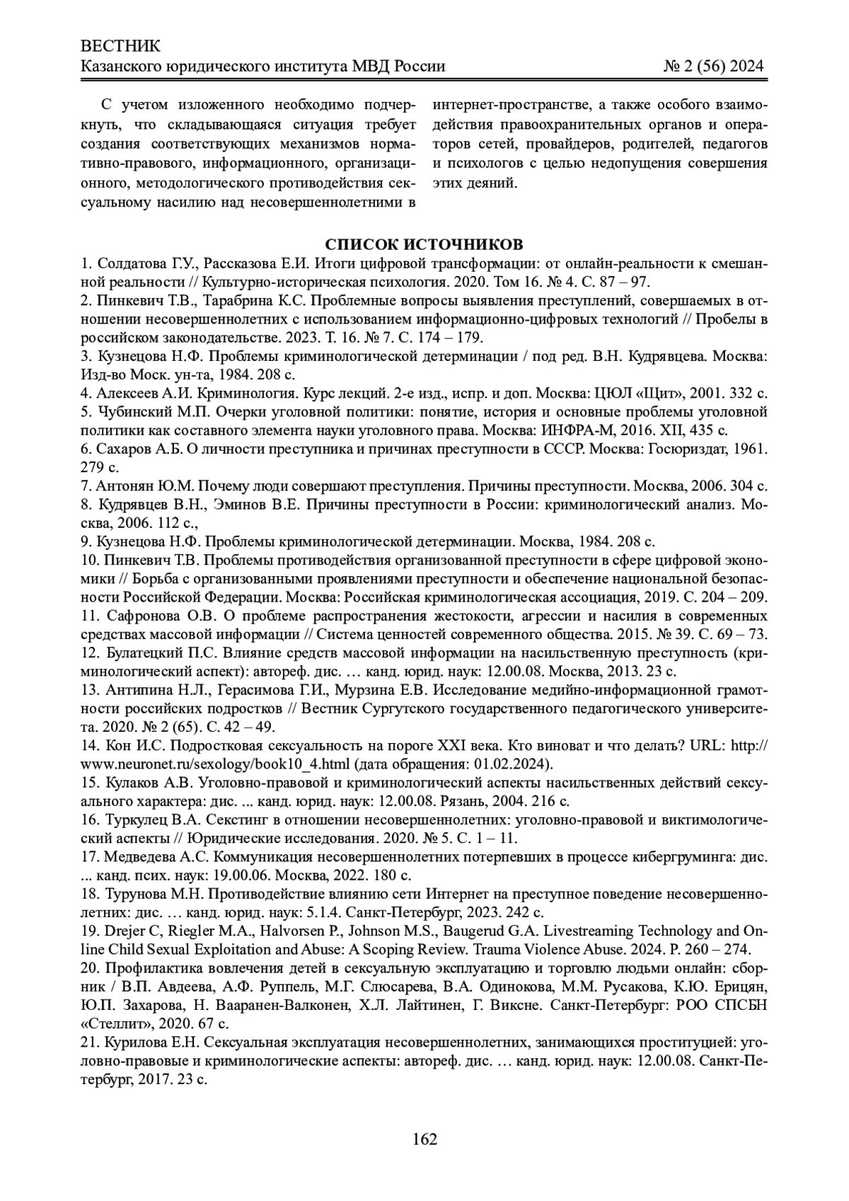 19. Drejer C, Riegler M.A., Halvorsen P., Johnson M.S., Baugerud G.A. Livestreaming Technology and Online Child Sexual Exploitation and Abuse: A Scoping Review. Trauma Violence Abuse. 2024. P. 260 - 274.