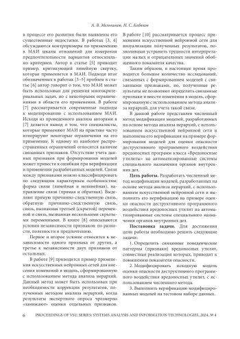 В статье рассматривается процесс формирования моделей для оценки показателя качества с использованием метода анализа иерархий, в предметных областях, которые характеризуются связанными признаками. Применение классического метода анализа иерархий не позволяет формировать модели со связанными признаками. Целью работы является разработка и верификация численного метода, который позволит модифицировать модели, сформированные с использованием метода анализа иерархий и увеличить их точность благодаря учету связи признаков. Верификация разработанного метода выполнена на примере формирования моделей оценки опасности деструктивных программных воздействий вредоносных программ класса вредоносные утилиты на автоматизированные системы специального назначения органов внутренних дел. На основе метода анализа иерархий, исходя из результатов опроса специалистов в области обеспечения информационной безопасности, сформирована исходная модель. Выявлены связанные поведенческие паттерны вредоносных утилит, совместная реализация которых, приводит к повышению значения показателя опасности исследуемой альтернативы. Для исследования связанных признаков сформирована искусственная нейронная сеть прямого распространения. Гиперпараметры искусственной нейронной сети определены таким образом, чтобы получить достаточную точность при верификации. Разработан численный метод, позволяющий учитывать связанные признаки в моделях, разработанных с использованием метода анализа иерархий. С использованием численного метода выполнена модификация и верификация исходной модели. Для верификации модели использовался тестовый набор данных, сформированный в ходе опроса экспертов. Верификация численного метода показала непротиворечивость полученных результатов. Результаты исследования могут быть использованы специалистами для формирования моделей оценки показателя качества, при связанных признаках.