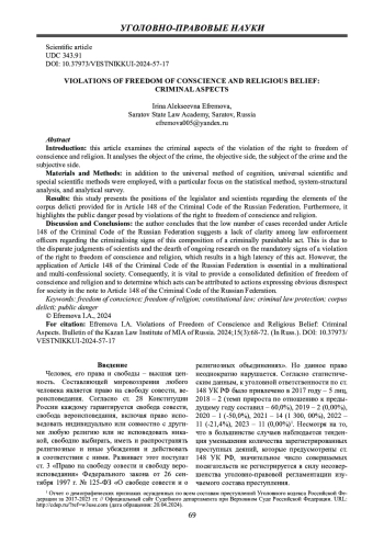 2. Арямов А.А., Руева Е.О., Пономаренко В.С. Вариация на тему уголовно-правовой охраны свободы вероисповедания в Российской Федерации // Известия высших учебных заведений. Уральский регион. 2014. № 3. С. 4-16. EDN: TETZJD
