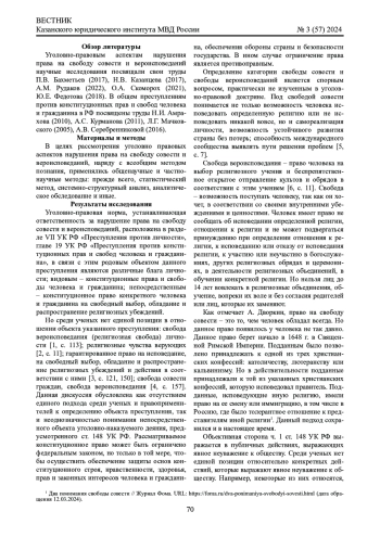 1. Чемеринский К.В. Уголовно-правовая характеристика состава воспрепятствования осуществлению права на свободу совести и вероисповеданий // Вестник Северо-Кавказского государственного технического университета. 2008. № 3 (16). С. 110-115.