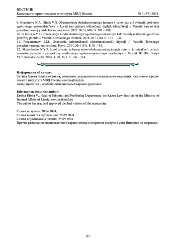 12. Скрипченко Н.Ю. Использование информационно-телекоммуникационных сетей в криминальных целях: нормативный учет и перспективы расширения уголовно-правового значения // Вестник РУДН. Серия Юридические науки. 2024. Т. 28. № 1. С. 196 - 214. EDN: QXGMAB