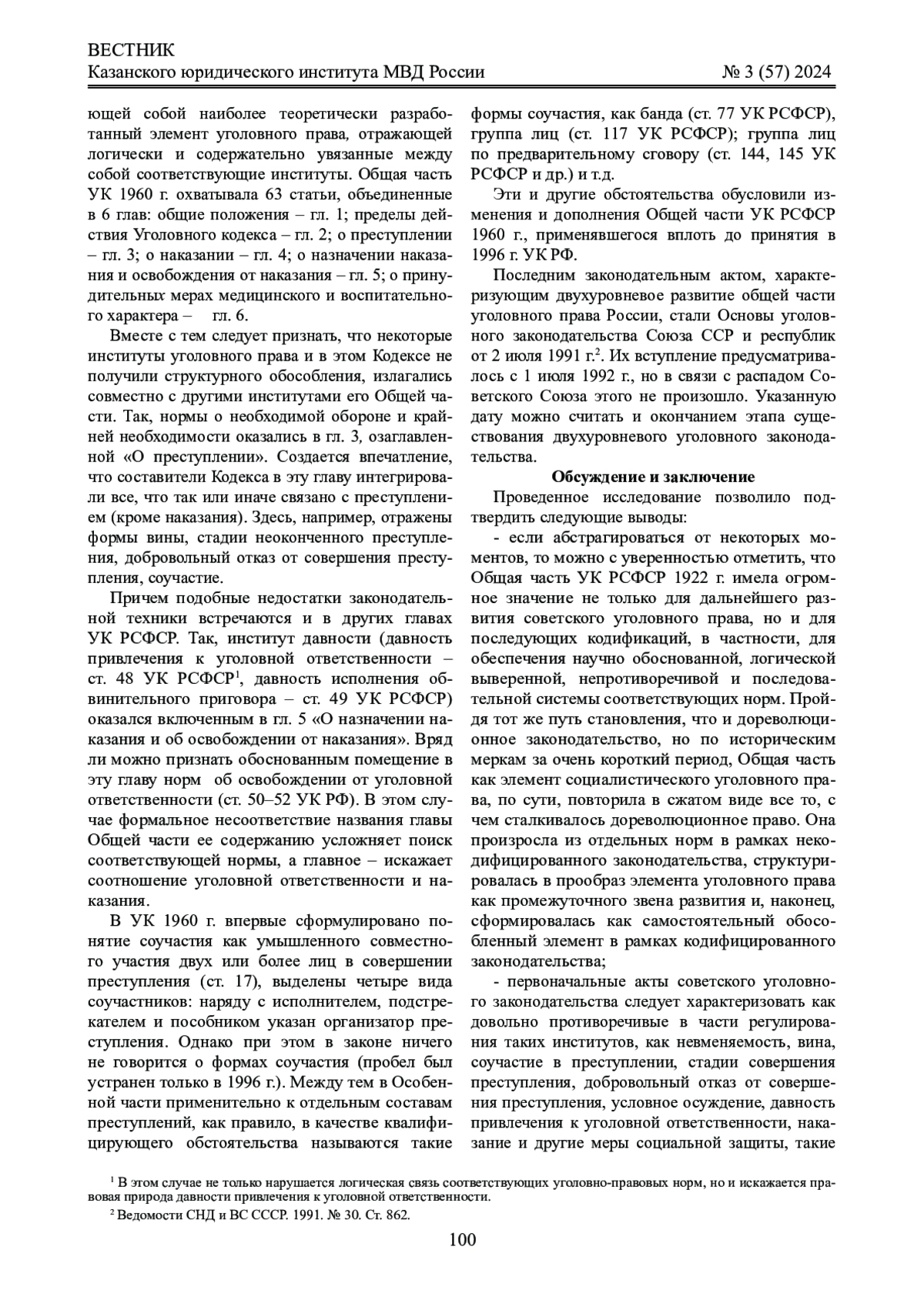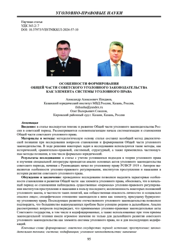 Обсуждение и заключение: проведенное исследование позволило выделить характерные особенности становления и развития Общей части как элемента уголовного права, обосновать, что в начальный период ее становления наблюдались существенные «перекосы» уголовно-правового регулирования институтов преступления и наказания в пользу последнего; коллизионность некоторых положений уголовного закона, в частности таких понятий, как «общественная опасность личности» и «социально опасное лицо»; специфическое отношение законодателя к вине как элементу, присущему буржуазному уголовному праву. Последующее развитие отечественного уголовного законодательства позволило подтвердить, что большинство вышеуказанных проблем было успешно решено в дальнейшем. Анализ рассмотренных вопросов подтверждает, что принимаемые уголовно-правовые законодательные акты Советского государства, в том числе и кодифицированные, а также использованные при этом приемы законодательной техники имели огромное значение не только для дальнейшего развития советского уголовного законодательства как элемента системы уголовного права, но и для последующих кодификаций.