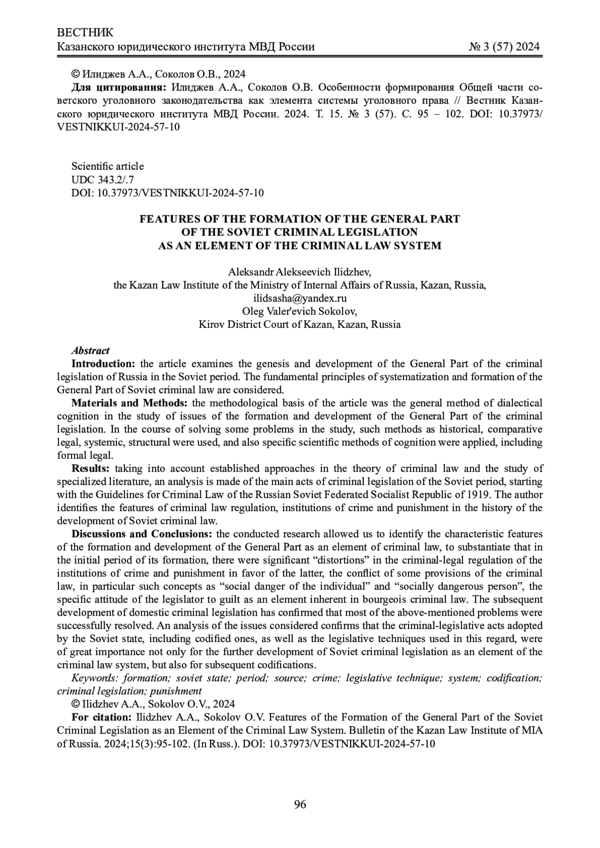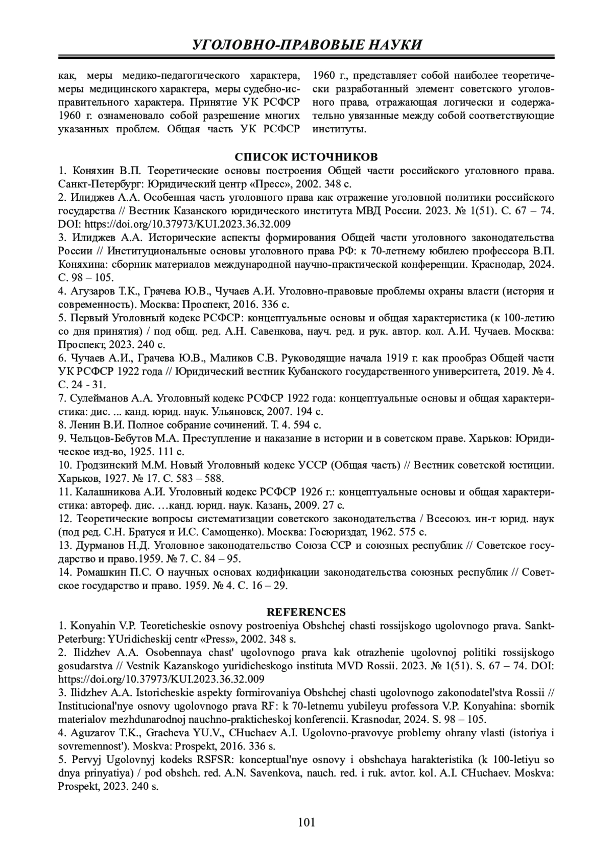 3. Илиджев А.А. Исторические аспекты формирования Общей части уголовного законодательства России // Институциональные основы уголовного права РФ: к 70-летнему юбилею профессора В.П. Коняхина: сборник материалов международной научно-практической конференции. Краснодар, 2024. С. 98 - 105. EDN: DKGWZZ