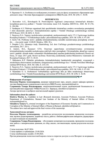 8. Назырова Н.А. Вопросы расследования преступлений, предусмотренных статьей 173.1 Уголовного кодекса Российской Федерации // Юридическая наука и правоохранительная практика. 2019. № 3 (49). С. 97-105. EDN: LBRHJU