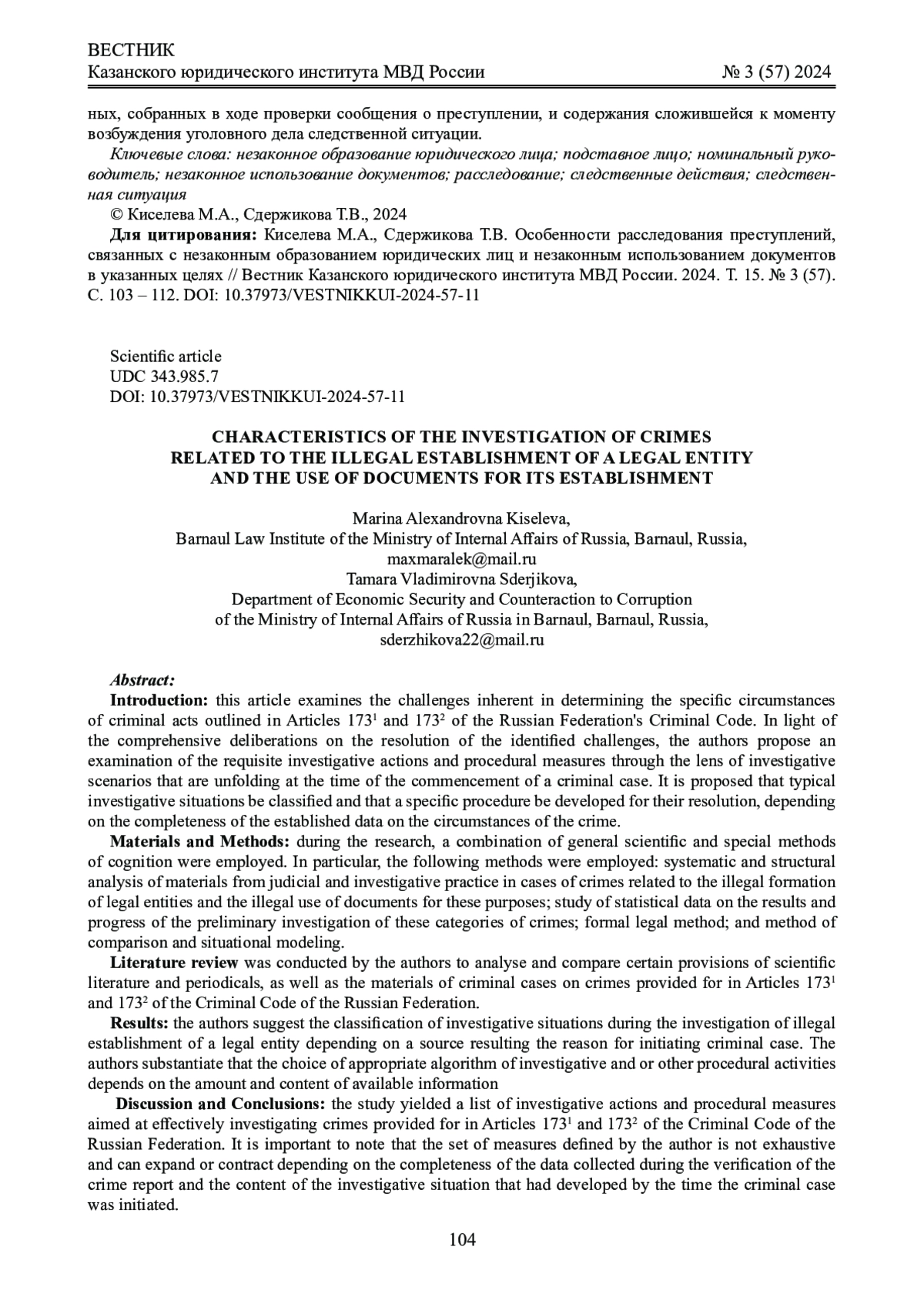 Материалы и методы: при проведении исследования применялись общенаучные и специальные методы познания. В частности, использовался метод системно-структурного анализа материалов судебно-следственной практики по делам о преступлениях, связанных с незаконным образованием юридических лиц и незаконным использованием документов в указанных целях; осуществлялось изучение статистических данных по результатам и ходу производства предварительного расследования в отношении указанных категорий преступлений; применены формально-юридический метод, метод сравнения и ситуационного моделирования.