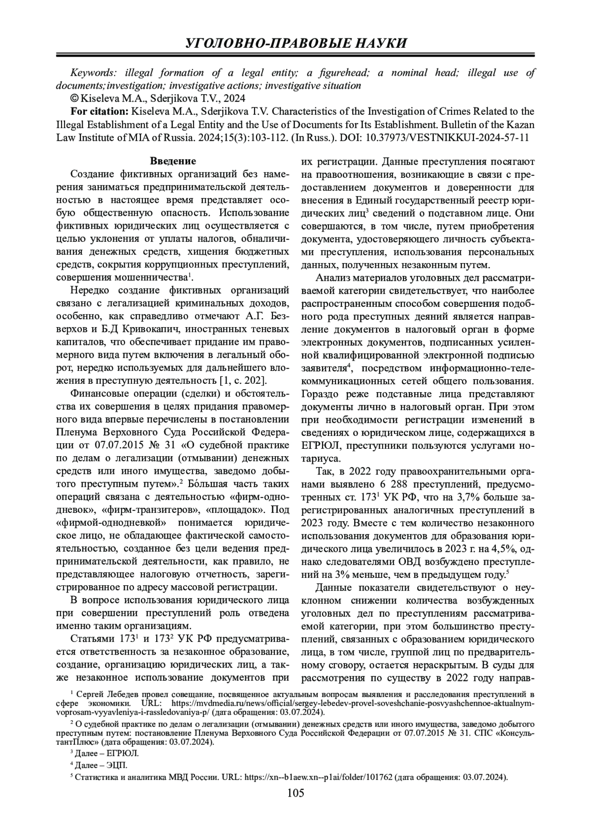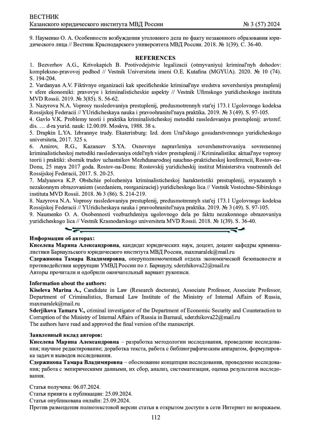2. Варданян А.В. Фиктивные организации как специфические криминальные средства совершения преступлений в сфере экономики: правовые и криминалистические аспекты // Вестник Уфимского юридического института МВД России. 2019. № 3(85). С. 56-62. EDN: EMOUQE