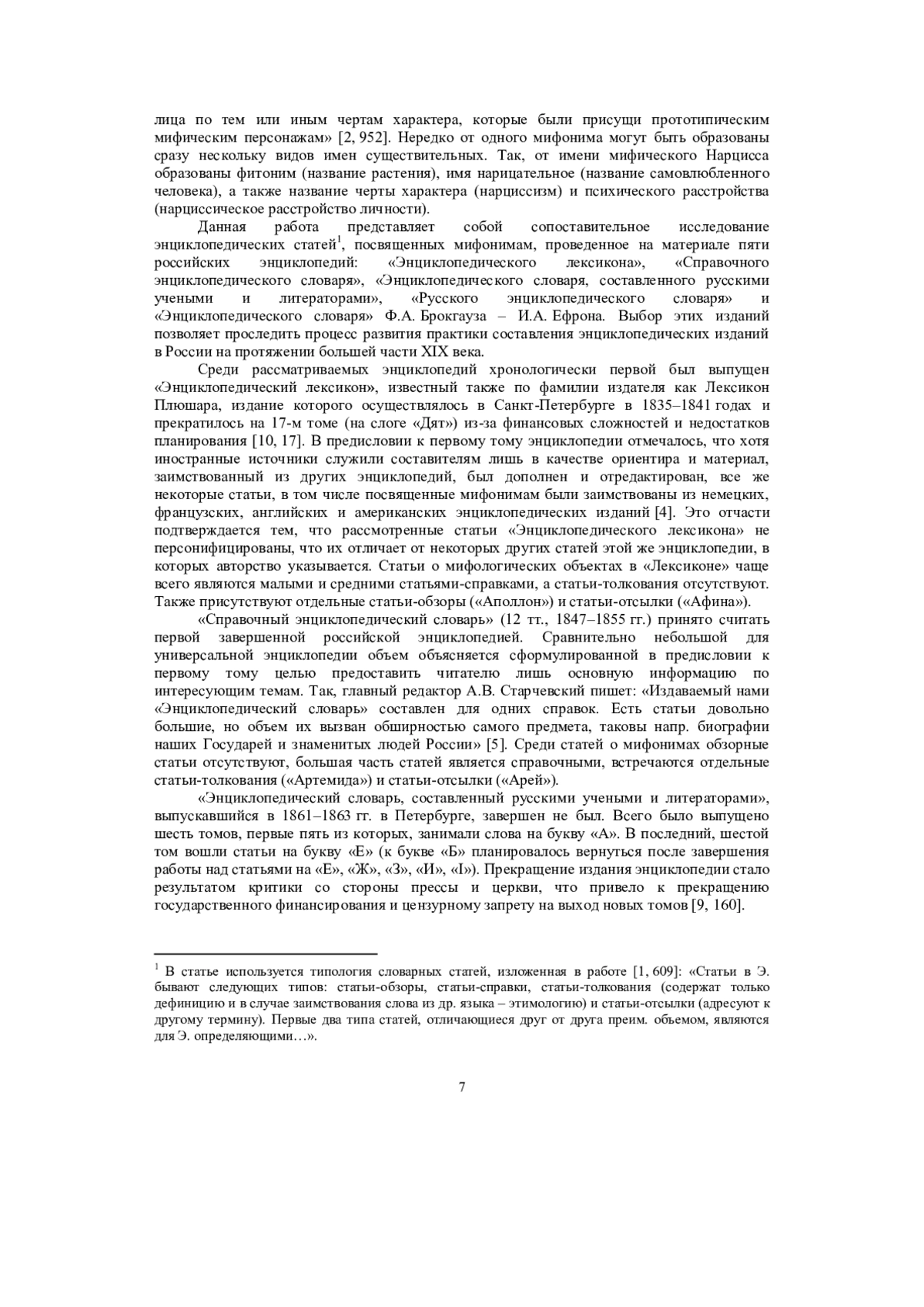 При создании современных российских энциклопедий, основанных на интеллектуальных технологиях представления и обработки научной информации, необходимо учитывать опыт составителей энциклопедий XIX в. Это и определило цель нашего исследования – выявление сходства и различия представления мифонимов в российских энциклопедиях XIX в. Ввиду незавершенности некоторых из них выбраны лишь 50 античных (древнегреческих и древнеримских) мифонимов на букву «А», вошедших в их словник. Задачи их исследования: 1) выявить особенности представления заголовочного слова в каждой из энциклопедий; 2) определить типы энциклопедических статей и критерии выбора типа статьи, используемые в каждой из энциклопедий; 3) рассмотреть, применяется ли в каждой из энциклопедий отсылочный способ подачи информации; 4) выяснить, присутствуют ли в энциклопедиях статьи, содержащие указание авторства.