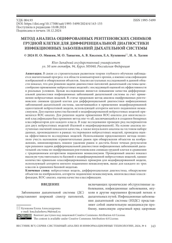 В связи со стремительным развитием теории глубокого обучения наблюдается значительный прогресс и в области компьютерного зрения, а именно классификации изображений и обнаружения объектов. Анализ актуальных исследований в данной области показал, что для решения задачи диагностики патологий дыхательной системы целесообразно применение нейросетевых моделей с последующей оценкой их эффективности в реальных условиях. Целью исследования является повышение качества дифференциальной диагностики инфекционных заболеваний дыхательной системы за счет применения нейросетевых моделей. В статье предложен метод анализа оцифрованных рентгеновских снимков грудной клетки для дифференциальной диагностики инфекционных заболеваний дыхательной системы, заключающийся в применении модифицированной одноэтапной нейросетевой модели, использующей алгоритм мягкого подавления немаксимумов. Для оценки качества базовой и модифицированной нейросетевых моделей применялся ROC-анализ. Для решения задачи применения ROC-анализа для многоклассовой классификации был применен метод one-vs-all, заключающийся в создании бинарных классификаторов для каждого класса. В ходе исследования проведен ряд экспериментов для двух нейросетевых моделей (базовой и модифицированной). На основе анализа полученных значений показателя качества, а также визуального анализа на тестовом наборе данных, произведенного в рамках тестирования нейросетевых моделей, проведена оценка эффективности исследуемых моделей. Использование предложенного метода позволило учесть наложение ограничительных рамок при обнаружении объектов на изображениях, минимизировать ложное удаление рамок и достичь более точных результатов при решении задачи дифференциальной диагностики инфекционных заболеваний дыхательной системы по оцифрованным рентгеновским снимкам грудной клетки в сравнении с традиционным алгоритмом подавления немаксимумов. Проведенный анализ показал высокую чувствительность базовой и модифицированной нейросетевых моделей, однако количество правильно классифицированных примеров для модифицированной модели, использующей алгоритм мягкого подавления немаксимумов, выше для каждого из трех классов в сравнении базовой моделью.