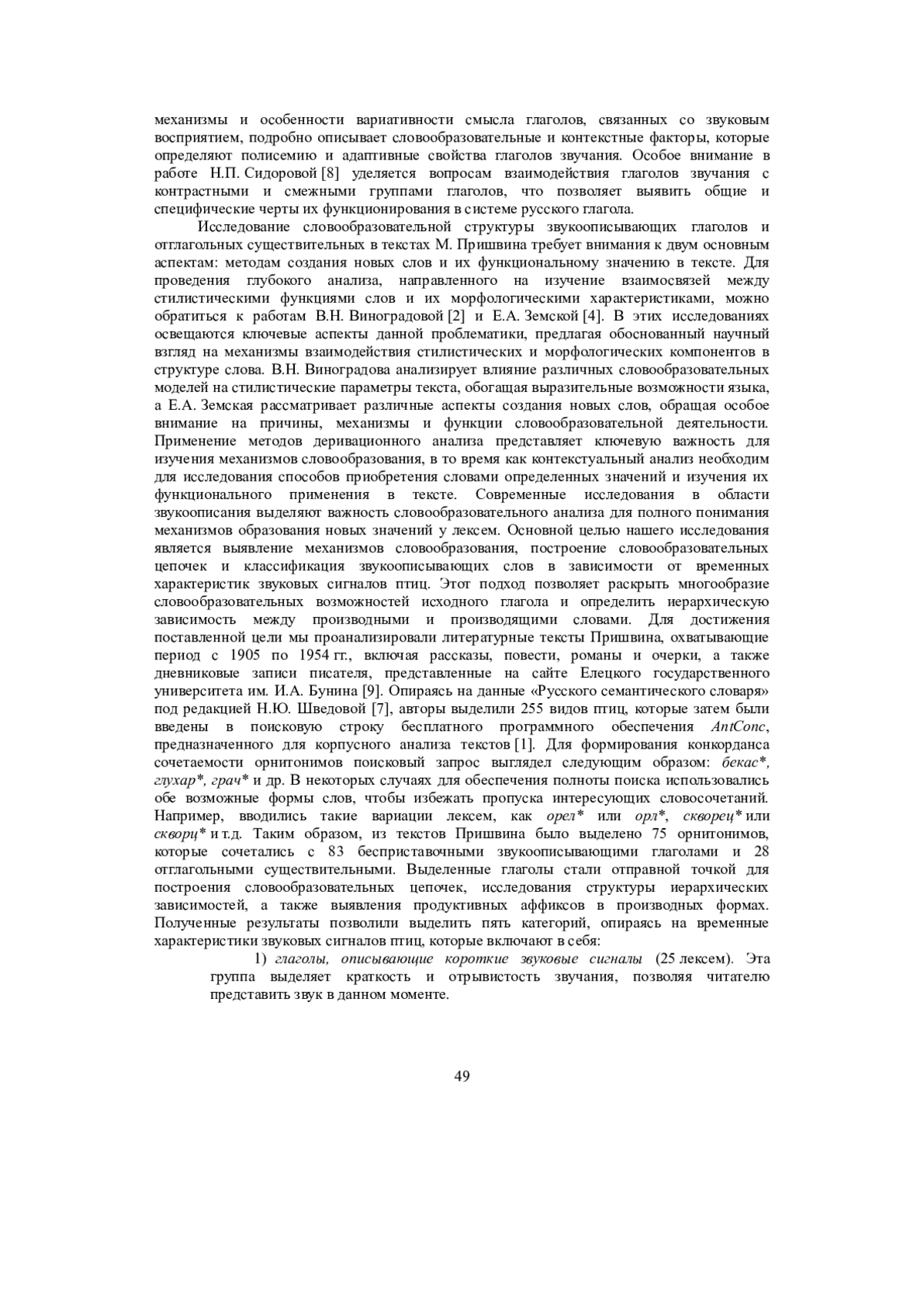 Статья посвящена изучению словообразовательных возможностей звукоописательных глаголов в произведениях М. Пришвина, что позволяет глубже понять механизмы формирования звуковых образов в художественном тексте. Авторы проводят детальный анализ звукоописательных глаголов и отглагольных существительных, которые играют ключевую роль в создании выразительной и эмоциональной атмосферы его произведений. Основное внимание уделяется деривационным процессам, обуславливающим создание новых слов. Выявляются продуктивные аффиксы, модели словообразования и способы формирования словообразовательных цепочек, что позволяет классифицировать глаголы по временным характеристикам звуковых сигналов птиц. Выделяются пять категорий глаголов: описывающие короткие, продолжительные, прерывистые звуковые сигналы, начальную и конечную фазы звучания. Для каждой категории приводятся примеры лексем, детализирующие их морфологические особенности, функциональное значение и влияние на стилистическое оформление текста. Важной частью исследования становится анализ отглагольных существительных, которые усиливают выразительность текста, сохраняя ключевые семантические характеристики исходных глаголов. Особое внимание уделяется индивидуально-авторским приемам М. Пришвина, который активно использует глаголы и существительные в непривычных значениях для описания звуков, издаваемых птицами. Кроме того, исследуются механизмы полисемии звукоописательных глаголов, их способность адаптироваться к различным контекстам и отражать эмоциональное состояние птиц. Анализ не только показывает, что звукоописательные глаголы в произведениях М. Пришвина обладают высокой степенью семантической гибкости, позволяя им адаптироваться в различных ситуациях и стилистически обогащать тексты, но и подтверждает значимость лексико-словообразовательного анализа для изучения механизмов формирования художественных образов в текстах М. Пришвина, а также подчеркивает роль звуковой палитры в создании определенной атмосферы его произведений. Звукоподражательные лексемы становятся мощным инструментом художественной выразительности, которые позволяют М. Пришвину превращать звук в средство создания различных образов, способных не только оживлять текст, но и формировать уникальный лексико-семантический код, отражающий глубинную связь языка и природы.