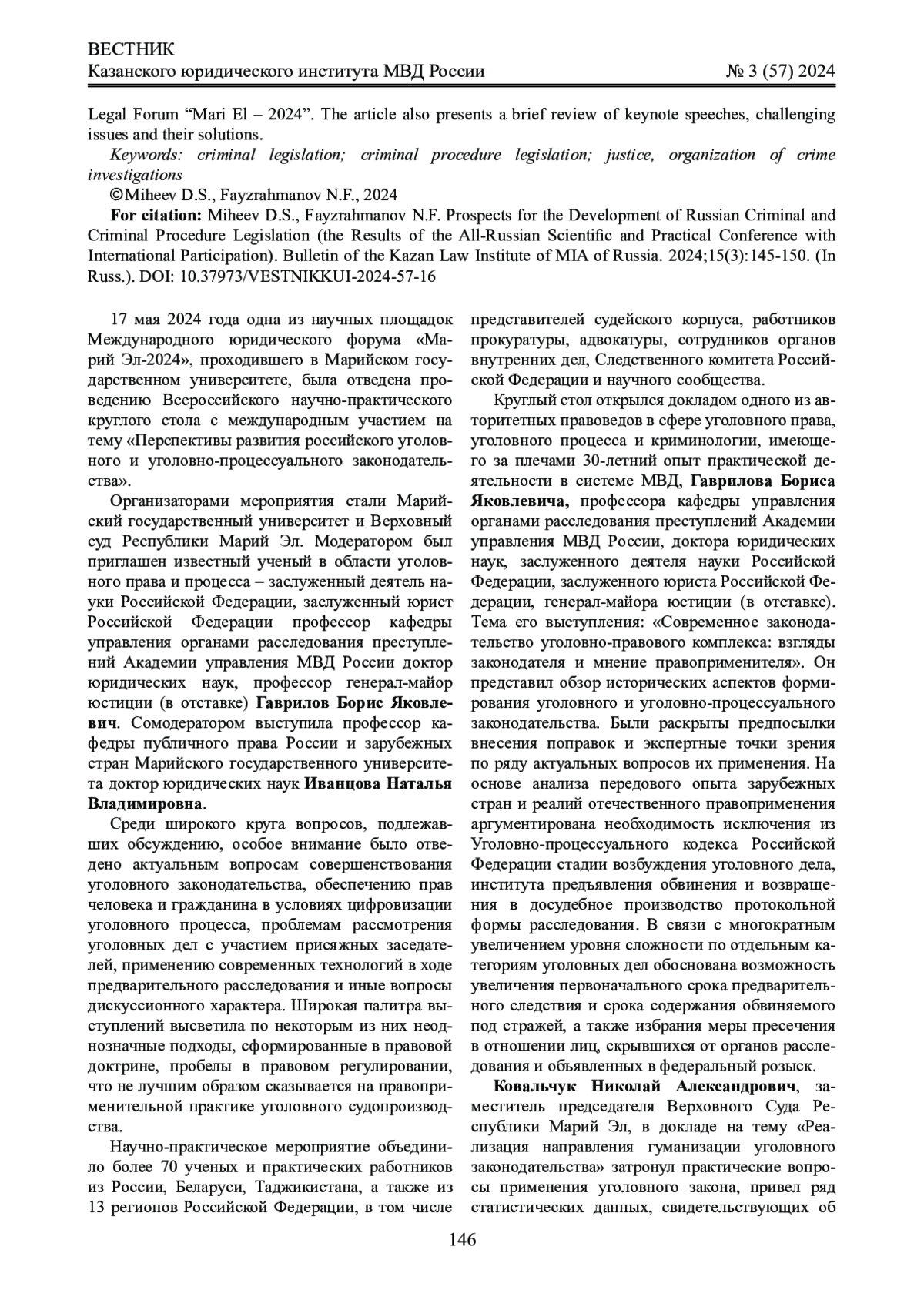 Статья посвящена итогам Всероссийского научно-практического круглого стола с международным участием «Перспективы развития российского уголовного и уголовно-процессуального законодательства», прошедшего 17 мая 2024 года в Марийском государственном университете в рамках Международного юридического форума «Марий Эл - 2024». Представлен краткий обзор выступлений основных спикеров данного научно-практического мероприятия, освещены поднимаемые в докладах проблемные вопросы и направления их решения.