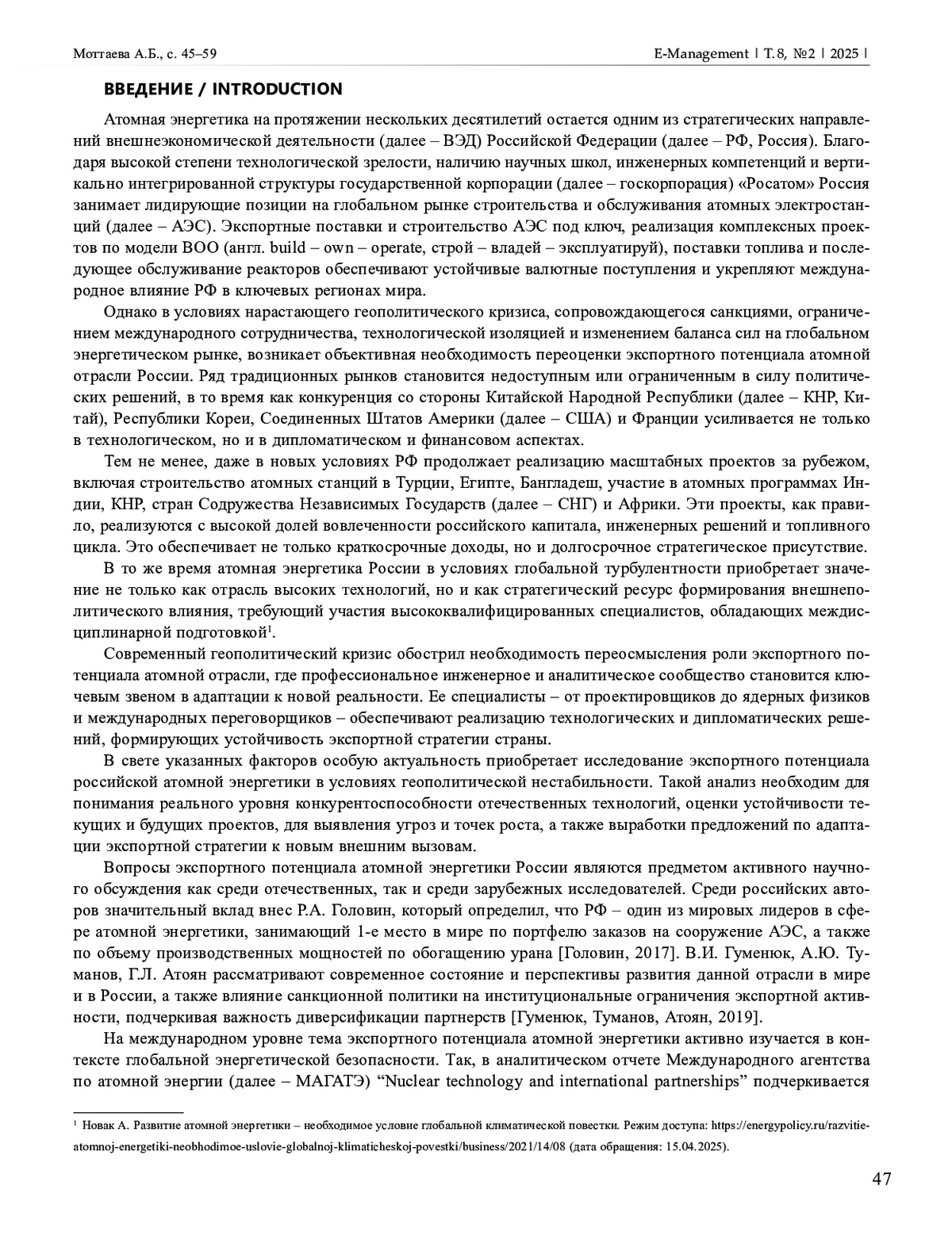 В последние десятилетия российская атомная промышленность активно осваивает внешние рынки, предлагая конкурентоспособные технологии, инфраструктурные решения и топливные услуги. В этом контексте целями исследования являются комплексное обоснование и практическая оценка экспортного потенциала атомной энергетики Российской Федерации (далее – РФ, Россия) в условиях усиления геополитического кризиса с учетом трансформации международной энергетической архитектуры, ограничений санкционного характера и изменения моделей глобального сотрудничества в ядерной сфере. Актуальность исследования заключается в том, что в условиях нарастающего геополитического напряжения атомная энергетика, являясь одним из наиболее наукоемких и высокотехнологичных сегментов отечественной экономики, обладает уникальным экспортным потенциалом, который проявляется не только в строительстве атомных электростанций (далее – АЭС) за рубежом, но и в поставках технологий, топлива, сервисов и компетенций. Тема охватывает стратегически важную задачу – определение роли и потенциала атомной энергетики как инструмента внешнеэкономической политики России и источника укрепления национального технологического суверенитета. Исследование направлено на оценку текущего состояния экспортных возможностей РФ в области строительства АЭС за рубежом, поставок ядерного топлива, технологий и инженерных решений, а также на разработку стратегических направлений устойчивого развития отрасли в условиях ограниченного доступа к западным рынкам и необходимости переориентации на партнерство с государствами Азии, Ближнего Востока, Африки и Латинской Америки.