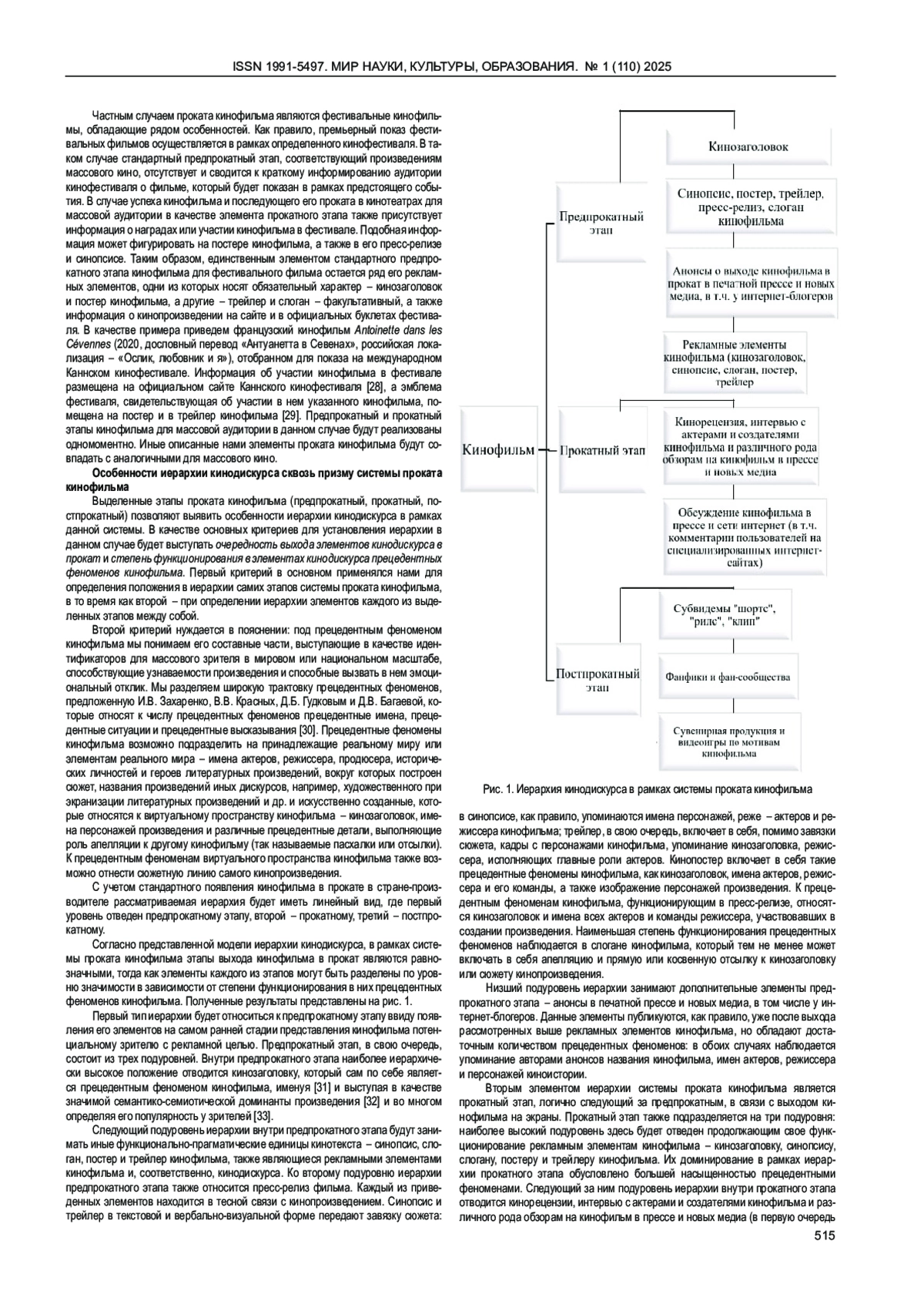 В статье рассматривается проблема определения иерархии кинодискурса в рамках системы проката кинофильма на примере французского кинодискурса. В данном случае кинодискурс понимается нами как особое семиотическое пространство, обладающее этноспецифическими и прагматическими особенностями репрезентации. Материалом исследования послужили французские кинофильмы 1954-2024 гг, их малоформатные тексты (кинозаголовок, синопсис, слоган, постер, трейлер) и полидискурсивные единицы кино- и других типов дискурса. Автором выявлены этапы реализации системы проката кинофильма: предпрокатный, прокатный и прокатный, каждый из которых обладает свойственной ему совокупностью элементов. Система проката кинофильма отличается линейной иерархией, где на основании критерия появления в прокате элементов каждого из этапов первый уровень отведен предпрокатному этапу, второй - прокатному этапу и третий - постпрокатному этапу. Внутри каждого из уровней иерархии выделены подуровни, состоящие из элементов конкретного этапа согласно критерию функционирования в них прецедентных феноменов кинофильма.