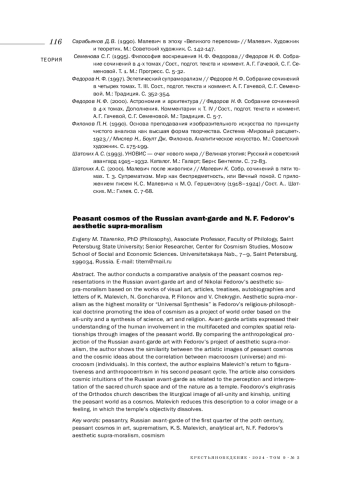 ТИТАРЕНКО Е. М. КРЕСТЬЯНСКИЙ КОСМОС РУССКОГО АВАНГАРДА И ЭСТЕТИЧЕСКИЙ СУПРАМОРАЛИЗМ Н. Ф. ФЕДОРОВА // КРЕСТЬЯНОВЕДЕНИЕ. 2024. Т. 9 № 3