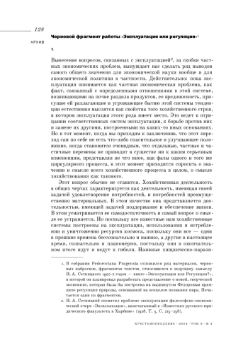 В настоящую публикацию включены архивные статьи и заметки Николая Александровича Сетницкого (1888-1937), философа, экономиста, статистика, одного их ведущих представителей той линии ноосферной, космической мысли 1920-1930-х гг., которая связана с продолжением и творческим развитием идей Н. Ф. Федорова. Публикуемые материалы относятся к 1923-1924 гг., когда Сетницкий жил и работал в Москве и совместно со своими друзьями-единомышленниками А. К. Горским и В. Н. Муравьевым занимался актуальной для первого пореволюционного десятилетия проблемой труда и научной организации труда. В отличие от теоретиков НОТ, мыслители-космисты федоровской ориентации трактовали труд как мироустроительную, космизующую и организующую деятельность человека в природе, направленную на преодоление хаоса, смерти, распада, как силу, противостоящую энтропии. Ряд публикуемых материалов предназначался для журнала «Октябрь мысли», с которым в 1924 г. активно сотрудничали Горский и Сетницкий. Размышления о цели труда соединялись с размышлениями о смысле культуры как благого возделывания и творческого преобразования мира. Статьи, связанные с проблемой трудового мироотношения, требующего активности человека в природе и противостоящего в этом смысле пассивно-потребительскому отношению к земле, выводили к выдвинувшейся в центр внимания для Сетницкого теме «Эксплуатация или регуляция?», разработку которой он вел в специальной статье. В подтексте статей, предназначавшихся для советской аудитории, был практически нивелирован религиозно-философский план трактовки понятий регуляции, труда и культуры, возводившихся Сетницким к исполнению заповеди «обладания землей», к эсхатологическому пересозданию мира, но некоторые словесные и смысловые обороты намекали на источную активно-христианскую направленность мысли философа. Публикуемые тексты хранятся в составе харбинского архива Н. А. Сетницкого в собрании Fеdoroviana Pragensia Литературного архива Музея национальной письменности (Чешская Республика). Ф. 341.