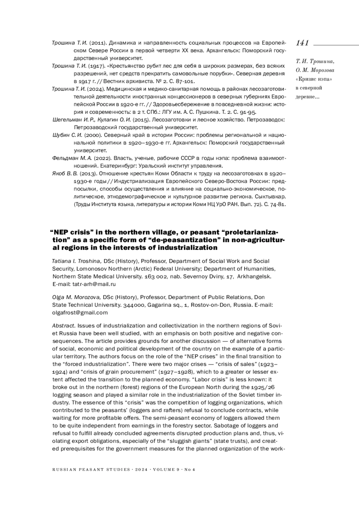 7. Дианова Е. В. (2019). Быт лесозаготовителей Европейского Севера (1920-е - начало 1930-х гг.) // Природно-географические факторы в повседневной жизни населения России: история и современность (региональный аспект). СПб.: ЛГУ им. А. С. Пушкина. С. 284-290. EDN: QNTPPW