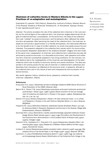 10. Лапердин В. Б. (2019). Аграрное освоение северных районов Западно-Сибирского края во второй половине 1930-х годов // Гуманитарные науки в Сибири. № 1. С. 11-16.