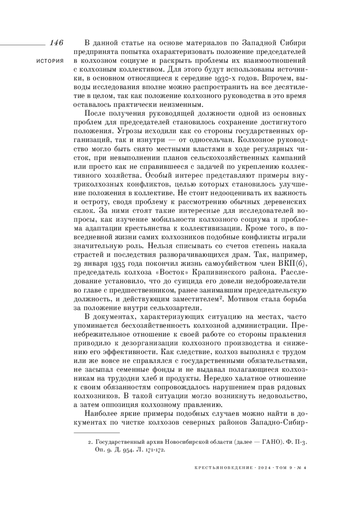 В представленной статье речь идет о роли председателя в колхозном социуме. Являясь центральной фигурой в колхозе, председатель во многом определял степень консолидации колхозников. Одновременно он сам являлся «порождением» окружающей социальной среды, а его поведение зачастую наглядно отражало атмосферу в коллективе. Став во главе колхоза, председатель реализовывал заложенные в коллективе возможности. В доброжелательной атмосфере руководитель эффективно действовал на благо всего коллектива. При конфликтных отношениях ему удавалось легче преследовать собственные интересы. Адаптация крестьянства к колхозному социуму протекала внутри колхозных коллективов и ее успешность зависела от взаимоотношений между односельчанами и их главой. Вместе с тем процесс коадаптации председателей и колхозных коллективов также определялся социальной средой. В благоприятной обстановке как крестьяне, так и председатели колхозов успешно приспосабливались к новым условиям жизни. Напротив, в ситуации конфликта происходила дезадаптация председателей и распад трудового коллектива, который терял способность к хозяйственной деятельности и плодотворному социальному взаимодействию. Представленные в статье материалы наглядно иллюстрируют ключевую роль председателей в колхозных коллективах, а также взаимодействие с ними, отражавшееся на хозяйственном уровне, отношении крестьян к колхозу и на характере рабочего и межличностного общения колхозников.