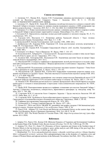 1. Антипина Т.Г., Панова Н.К., Корона О.М. Голоценовая динамика растительности и природных условий на Восточном склоне Северного Урала // Экология. 2014. № 5. С. 353-361. DOI: 10.7868/S0367059714050023 EDN: SKIBQL