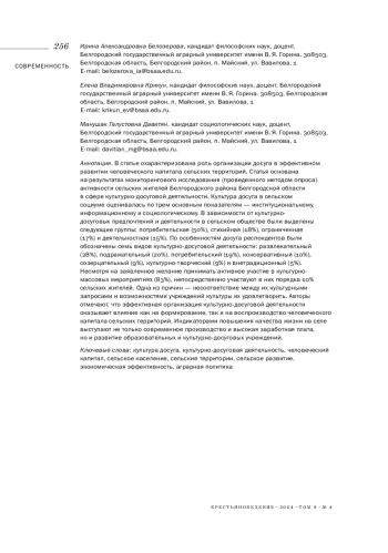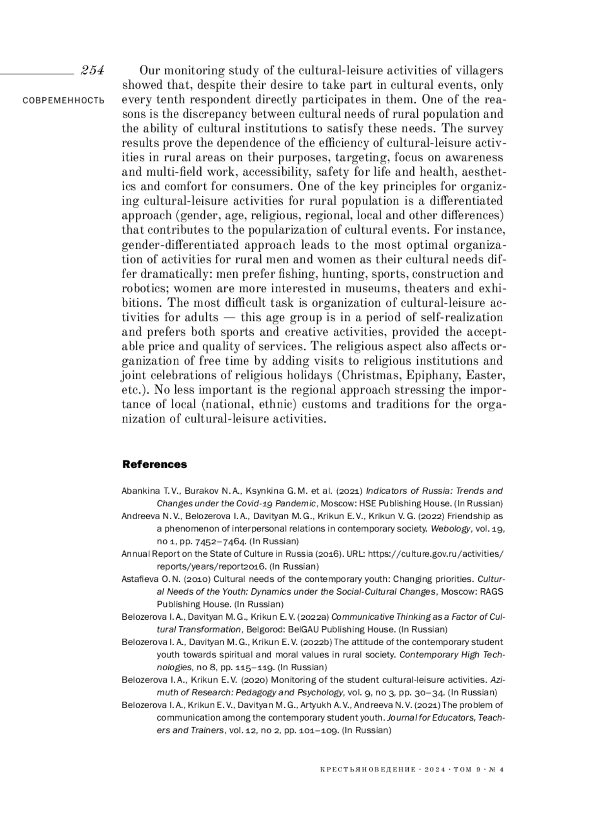 6. Belozerova I. A., Davityan M. G., Krikun E. V. (2022b) The attitude of the contemporary student youth towards spiritual and moral values in rural society. Contemporary High Technologies, no 8, pp. 115-119. (In Russian). EDN: BCAMEJ