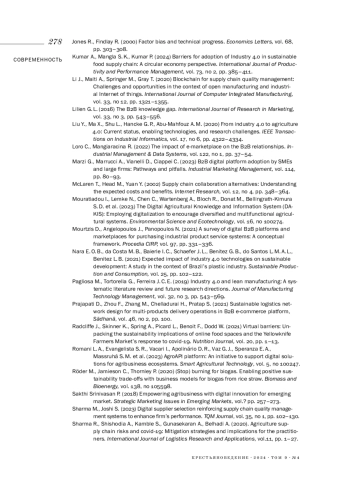 32. Kumar A., Mangla S. K., Kumar P. (2024). Barriers for adoption of Industry 4.0 in sustainable food supply chain: A circular economy perspective // International Journal of Productivity and Performance Management. Vol. 73. № 2. P. 385-411.