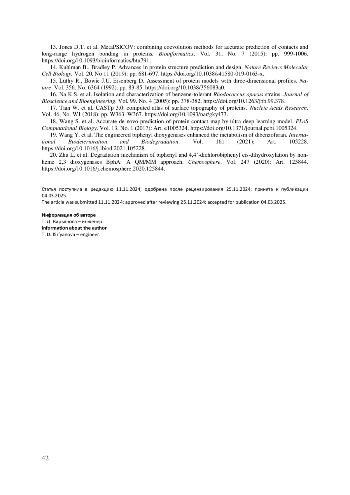 7. Dhindwal S. et al. Structural basis of the enhanced pollutant-degrading capabilities of an engineered biphenyl dioxygenase // Journal of Bacteriology. 2016. Vol. 198, № 10. Р. 1499-1512. DOI: 10.1128/jb.00952-15