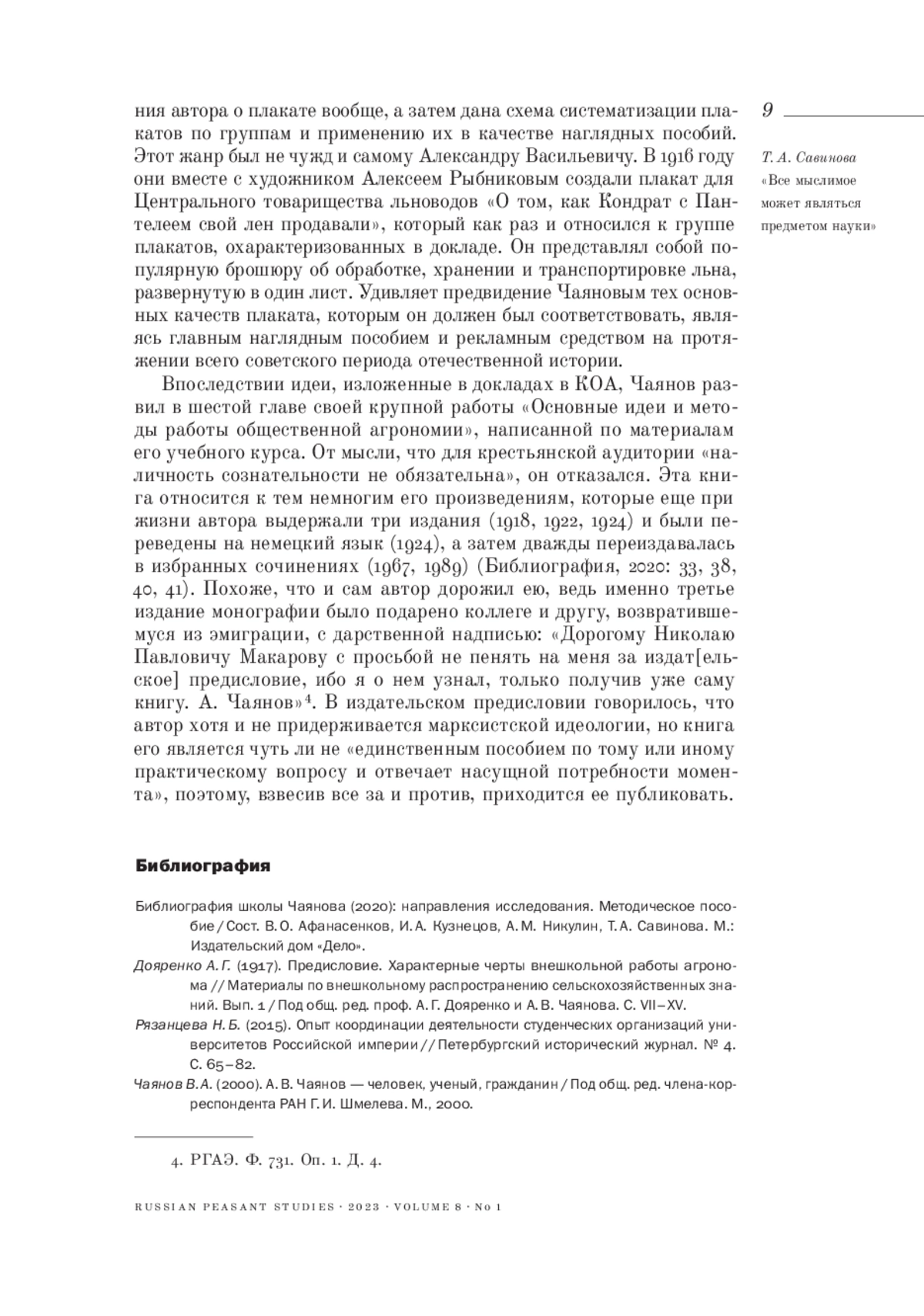 1. Библиография школы Чаянова (2020): направления исследования. Методическое пособие / Сост. В. О. Афанасенков, И. А. Кузнецов, А. М. Никулин, Т. А. Савинова. М.: Издательский дом “Дело”.
