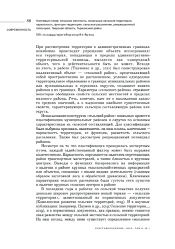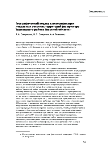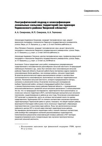 Статья: ГЕОГРАФИЧЕСКИЙ ПОДХОД К КЛАССИФИКАЦИИ ЛОКАЛЬНЫХ СЕЛЬСКИХ ТЕРРИТОРИЙ (НА ПРИМЕРЕ ТОРЖОКСКОГО РАЙОНА ТВЕРСКОЙ ОБЛАСТИ) (2024)