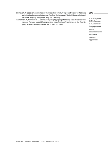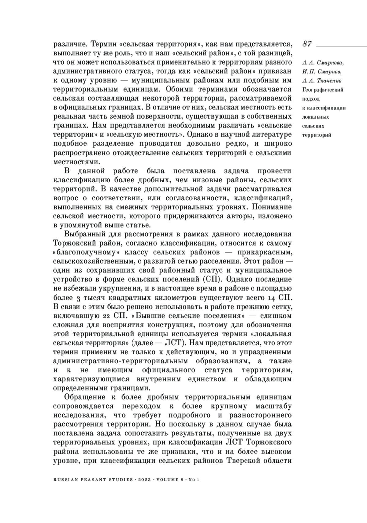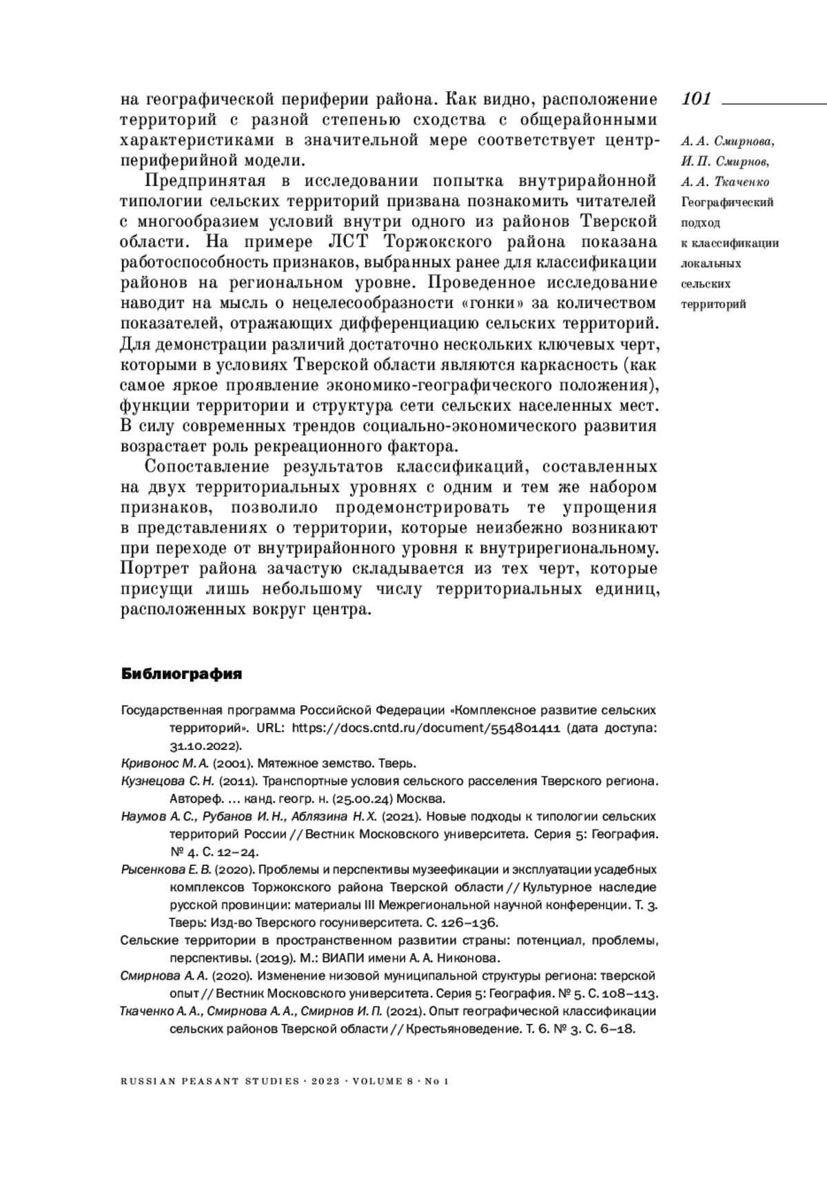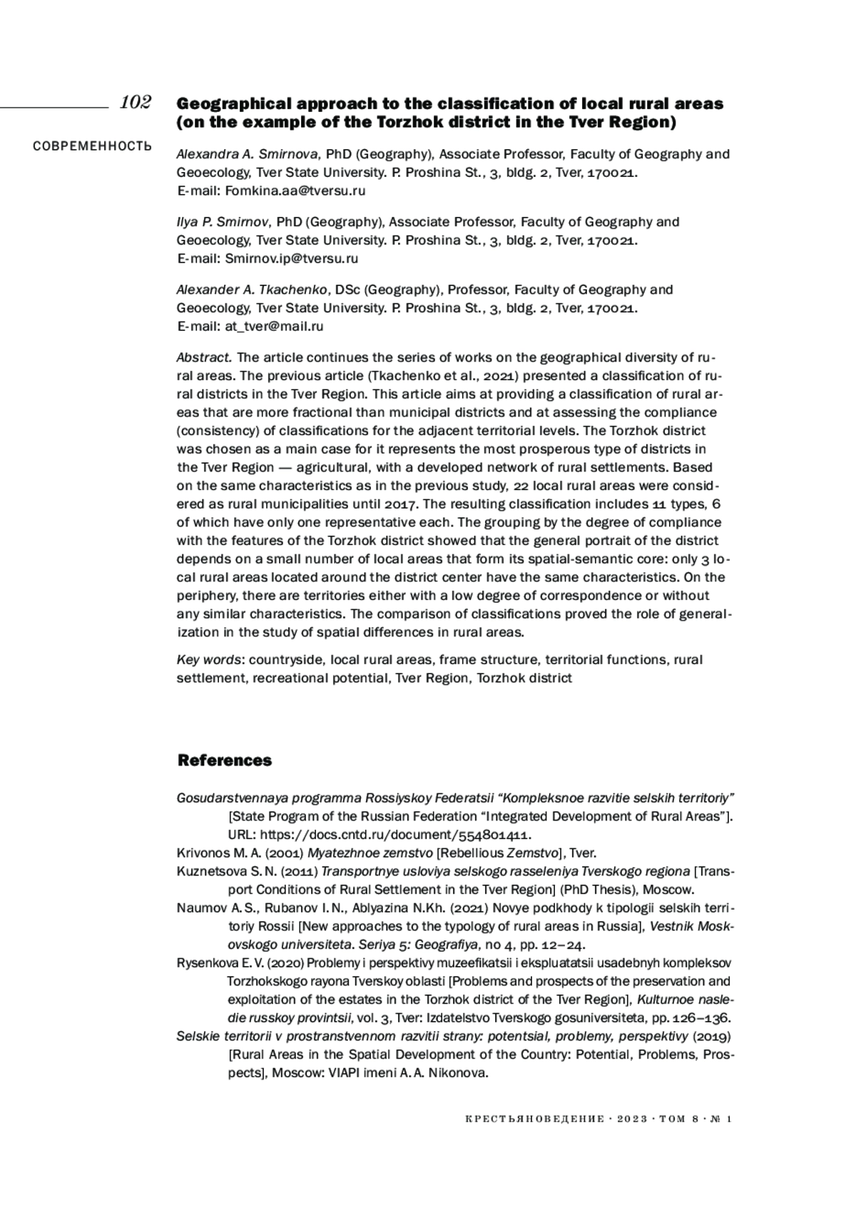 СМИРНОВА А. А., СМИРНОВ И. П., ТКАЧЕНКО А. А. ГЕОГРАФИЧЕСКИЙ ПОДХОД К КЛАССИФИКАЦИИ ЛОКАЛЬНЫХ СЕЛЬСКИХ ТЕРРИТОРИЙ (НА ПРИМЕРЕ ТОРЖОКСКОГО РАЙОНА ТВЕРСКОЙ ОБЛАСТИ) // КРЕСТЬЯНОВЕДЕНИЕ. 2023. Т. 8 № 1