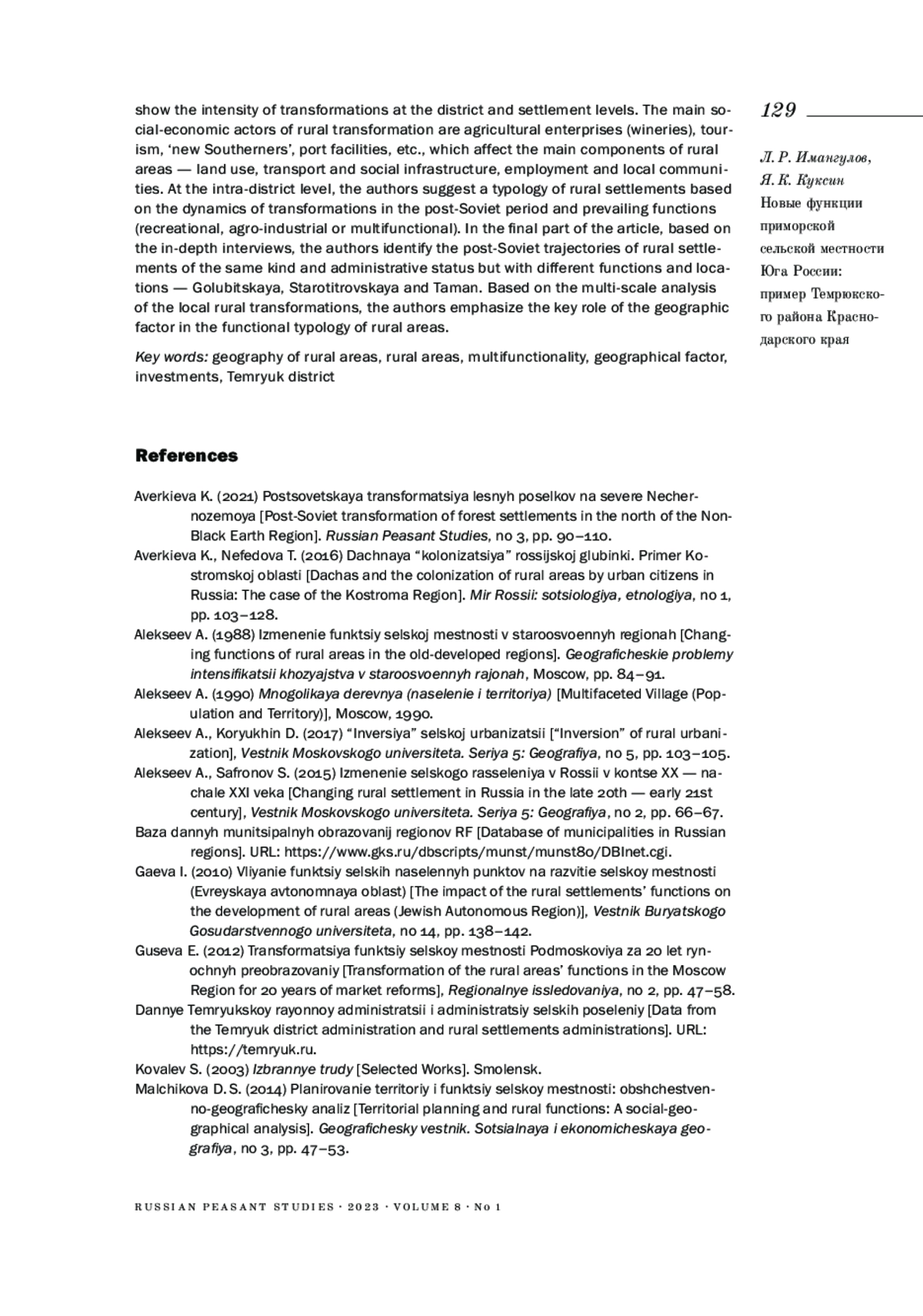 В статье рассмотрены новые функции приморской сельской местности Юга России в постсоветский период. Обозначены региональные особенности постсоветской трансформации приморской сельской местности, среди которых сохранение аграрной специализации и занятости, рост численности сельского населения, появление новых функций сельской местности, положительный миграционный баланс территории и т. д. На основе динамики доступных социально-экономических показателей (инвестиции в основной капитал, численность населения, миграционный прирост и т. д.) обозначены масштабы интенсивности трансформационных процессов на уровне района, сельских поселений и населенных пунктов. Выявлены ведущие социально-экономические акторы преобразования сельской местности: агропредприятия (винодельческие хозяйства), туризм, «новые южане», портовое хозяйство и др. Проведена оценка их влияния на основные компоненты сельской местности - землепользование, транспортную и социальную инфраструктуру, занятость населения и локальные сообщества. На внутрирайонном уровне представлена типология сельских поселений в соответствии с динамикой трансформационных процессов в постсоветский период и преобладающие функциональные типы сельских населенных пунктов («агропромышленный», «рекреационный», «полифункциональный»). В заключительной части с использованием выдержек из глубинных интервью детально описаны постсоветские траектории трансформации сельских населенных пунктов одного рода и административного статуса, но с разным функциональным типом и географическим положением - Голубицкой, Старотитаровской и Тамани. На основании полимасштабного анализа трансформации сельской местности выявлена ведущая роль фактора географического положения населенного пункта/территории в функциях сельской местности.