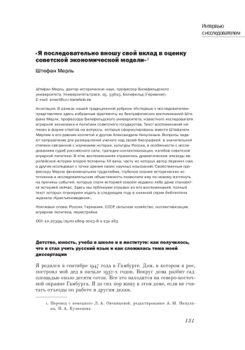 В рамках нашей традиционной рубрики «Интервью с исследователем» представляем здесь избранные фрагменты из биографических воспоминаний Штефана Мерля, профессора Билефельдского университета, известного исследователя аграрной экономики и политики советского государства. Текст воспоминаний написан в форме ответов на вопросы, которые сформулированы вместе Штефаном Мерлем и его давним коллегой и другом Александром Никулиным. Вопросы задают направление для размышлений ученого над своей биографией в значительной степени связанной с изучением истории, культуры России, в особенности с исследованием судеб российского села, трагедии коллективизации, изгибов советской аграрной политики. В этих воспоминаниях отразились драматические эпизоды европейской истории второй половины ХХ века, часть из которых автор пережил сам, а другие исследовал с точки зрения своих научных изысканий. Свойственные профессору Мерлю феноменальное трудолюбие, глубокое знание исторических источников и исследовательская объективность позволили ему по-новому взглянуть на причины событий, которые стали историей совсем недавно либо даже становятся историей сейчас. Здесь мы публикуем отрывок из его воспоминаний, полный текст которых планируем издать в следующем году в книжной серии библиотеки журнала «Крестьяноведения».