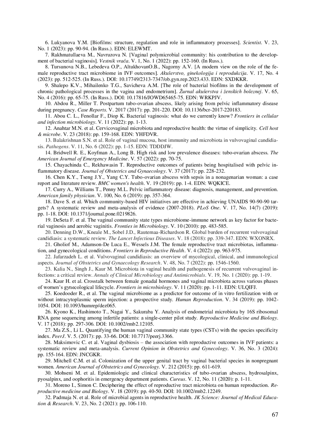 8. Турсунова Н.Б. и др. Современный взгляд на роль микробиома женского репродуктивного тракта в исходах ЭКО // Акушерство, гинекология и репродукция. 2023. Т. 17, № 4. С. 512-525. DOI: 10.17749/2313-7347/ob.gyn.rep.2023.433 EDN: SXDKKR