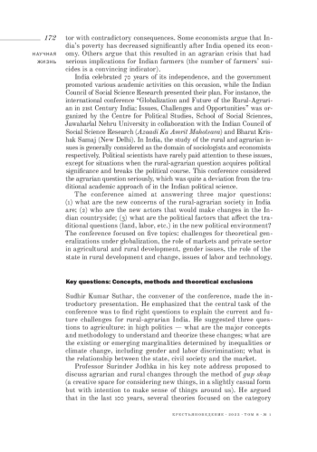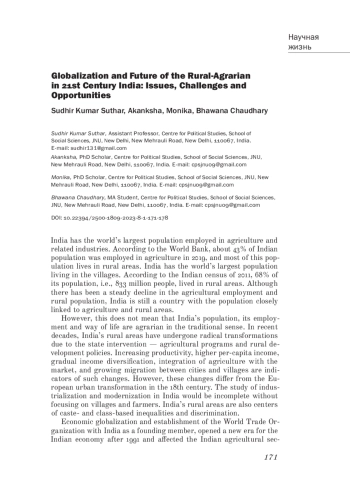 СУДХИР К. С., AKANKSHA A., MONIKA M., CHAUDHARY B. GLOBALIZATION AND FUTURE OF THE RURAL-AGRARIAN IN 21ST CENTURY INDIA: ISSUES, CHALLENGES AND OPPORTUNITIES // КРЕСТЬЯНОВЕДЕНИЕ. 2023. Т. 8 № 1