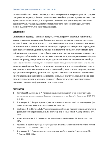 ГАНЕЕВА Э. Р., ЛУЗАНОВА А. С. ГЕНЕРАЛИЗАЦИЯ КАК СПОСОБ ПРАГМАТИЧЕСКОЙ АДАПТАЦИИ В СИНХРОННОМ ПЕРЕВОДЕ // ДОКЛАДЫ БАШКИРСКОГО УНИВЕРСИТЕТА. 2025. Т. 10 № 1