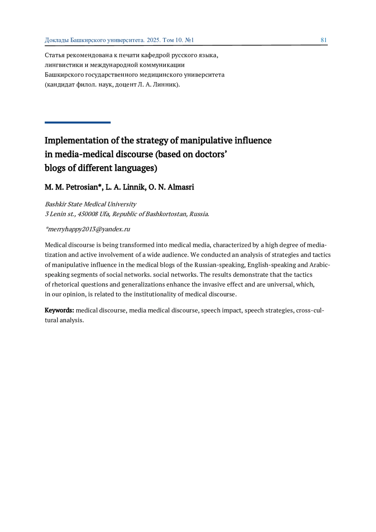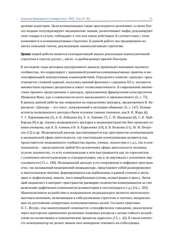 Медицинский дискурс трансформируется в медиамедицинский, характеризующийся высокой степенью медиатизации и активным вовлечением широкой аудитории. Мы провели анализ стратегий и тактик манипулятивного воздействия в медицинских блогах русскоязычного, англоязычного и арабоязычного сегментов социальных сетей. Результаты демонстрируют, что тактики риторических вопросов и обобщений усиливают персуазивный эффект и являются универсальными, что, на наш взгляд, связано с институциональностью медицинского дискурса.