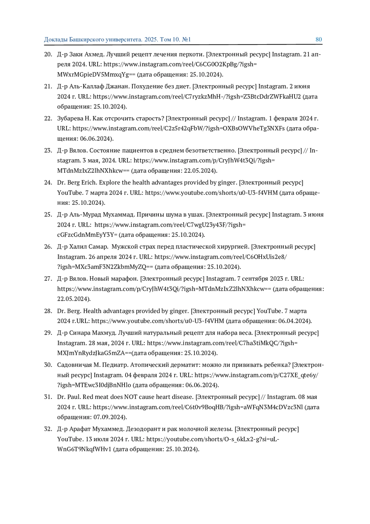 29. Д-р Синара Махмуд. Лучший натуральный рецепт для набора веса. [Электронный ресурс] Instagram. 28 мая, 2024 г. URL: https://www.instagram.com/reel/C7ha3tiMkQC/?igsh= MXJmYnRydzJkaG5mZA==(дата обращения: 25.10.2024).