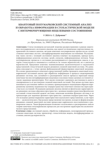 ДУБРОВИН А. С. КВАНТОВЫЙ ПОЛУМАРКОВСКИЙ СИСТЕМНЫЙ АНАЛИЗ И ОБРАБОТКА ИНФОРМАЦИИ В СТОХАСТИЧЕСКОЙ МОДЕЛИ С ИНТЕРФЕРИРУЮЩИМИ НЕЦЕЛЕВЫМИ СОСТОЯНИЯМИ // ВЕСТНИК ВОРОНЕЖСКОГО ГОСУДАРСТВЕННОГО УНИВЕРСИТЕТА. СЕРИЯ: СИСТЕМНЫЙ АНАЛИЗ И ИНФОРМАЦИОННЫЕ ТЕХНОЛОГИИ. 2024. № 2